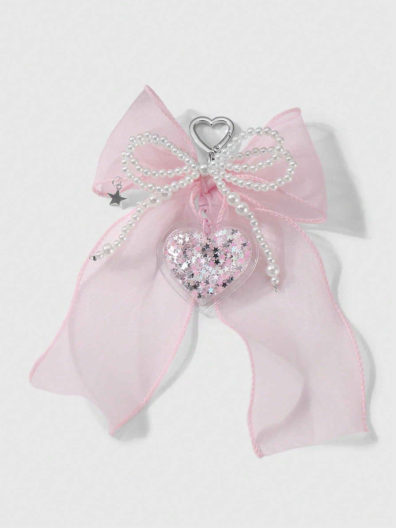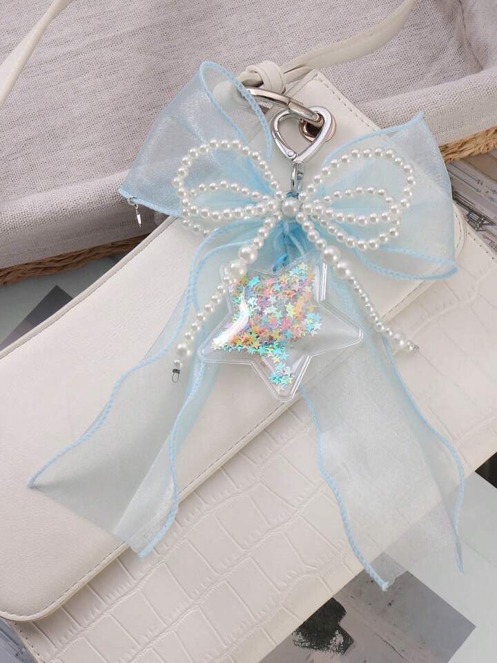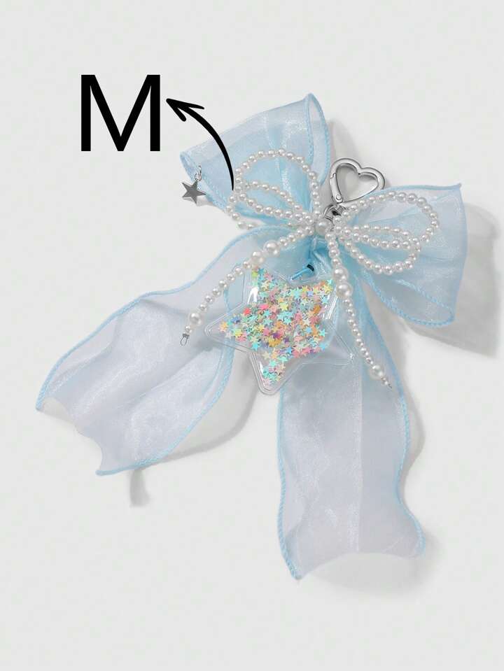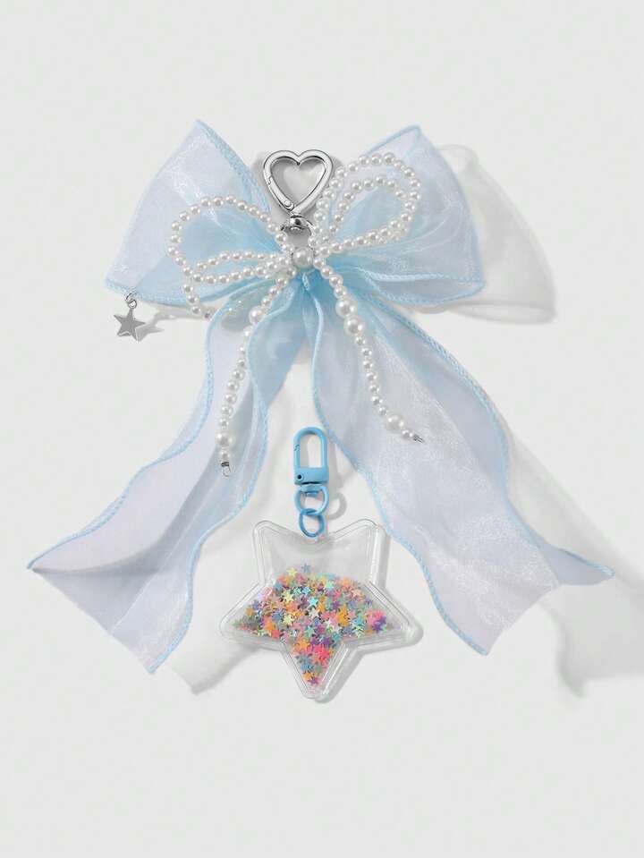 Kawaii 1 pezzo Set combinato elegante e minimalista di ciondoli a forma di cuore e stella con perle, fiocco in tulle rosa/blu e paillettes trasparenti, decorazione dolce e alla moda per borse, versatile per le donne, regalo perfetto