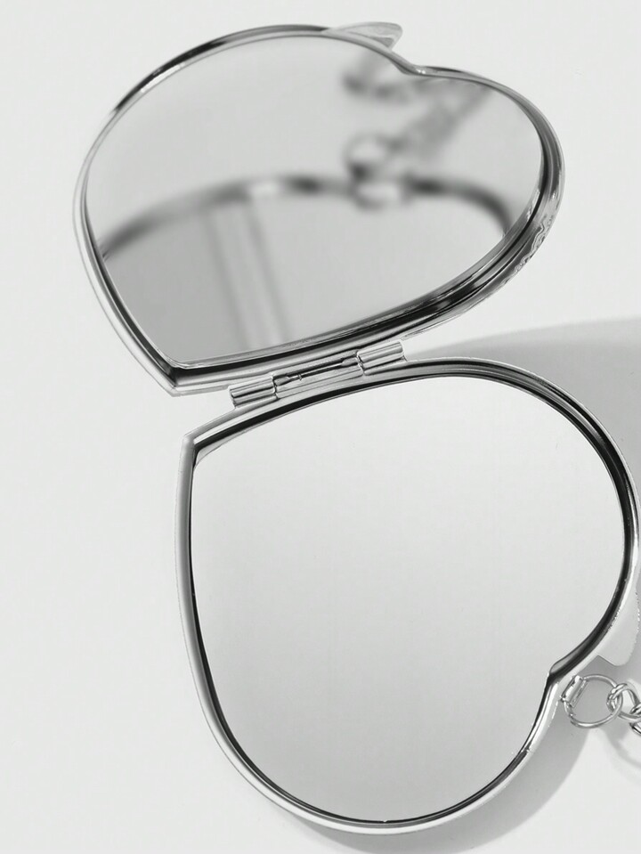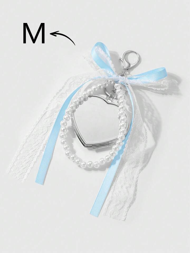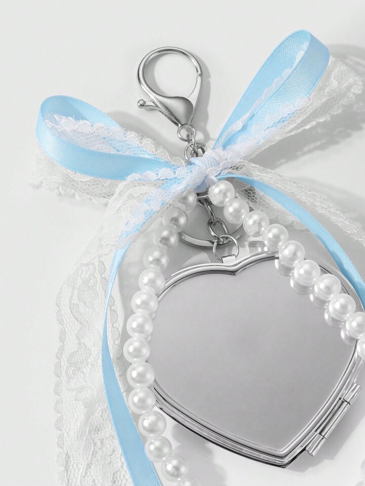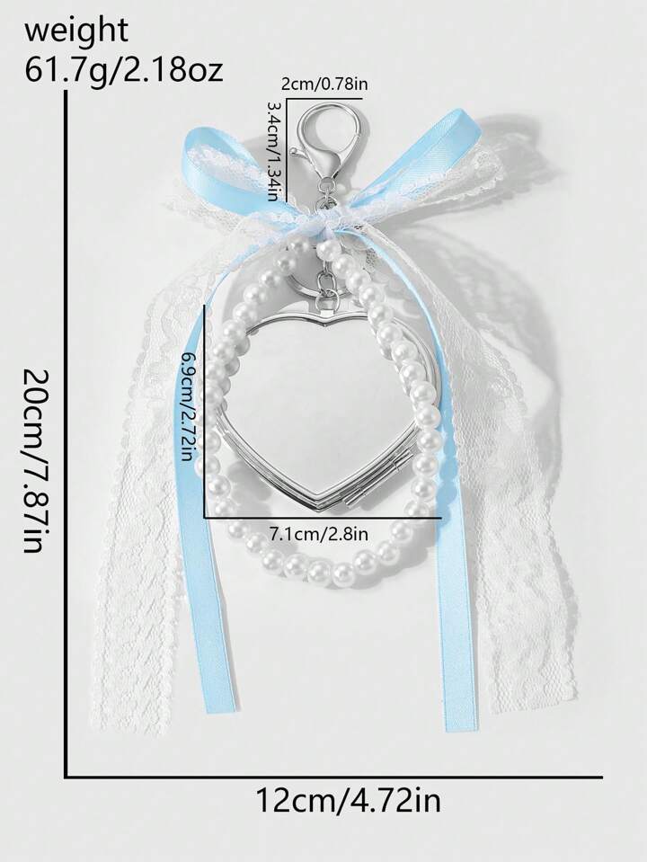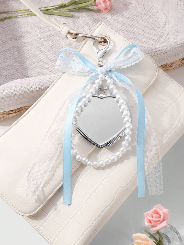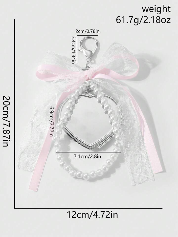 Kawaii 1 pezzo Ciondolo portachiavi con charms versatili, delicati e alla moda, realizzati a mano con perle bianche finte di alta qualità, fiocco in tulle, pendente a forma di cuore demoniaco e specchio bifacciale, adatto per donne e ragazze per uso quotidiano, come regalo per le vacanze