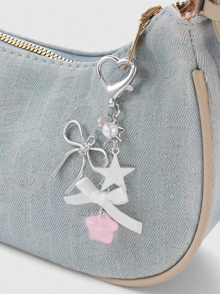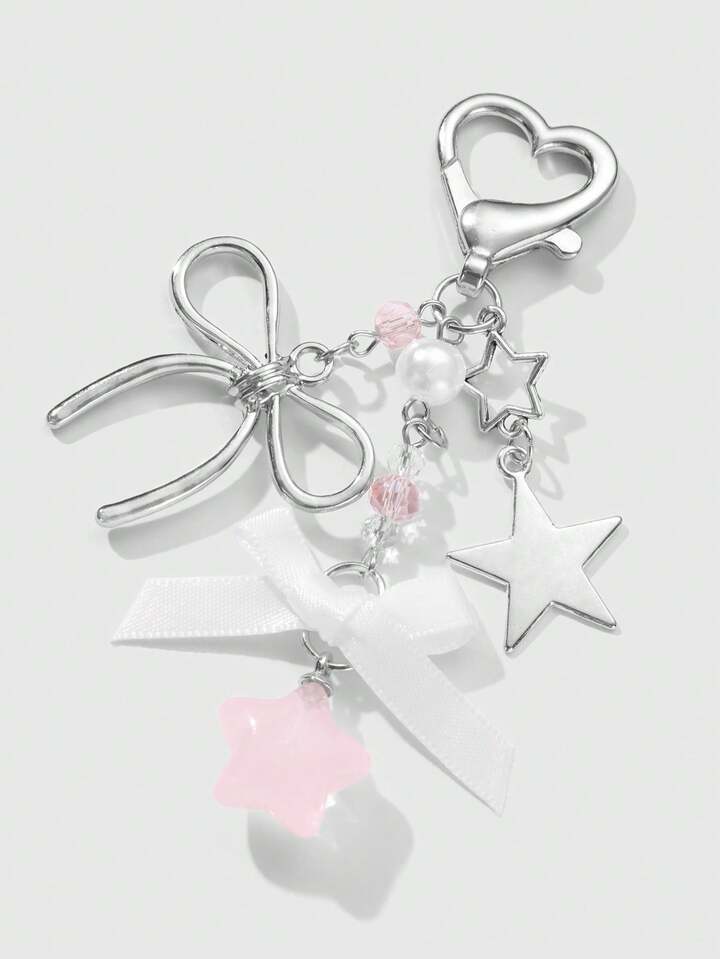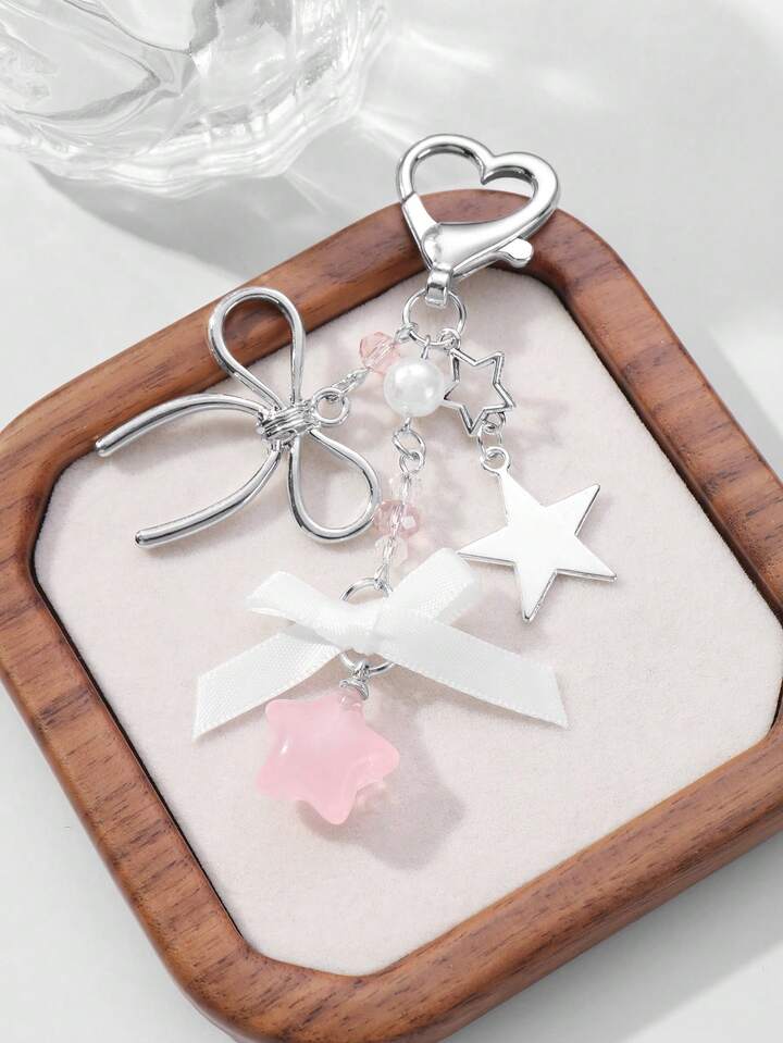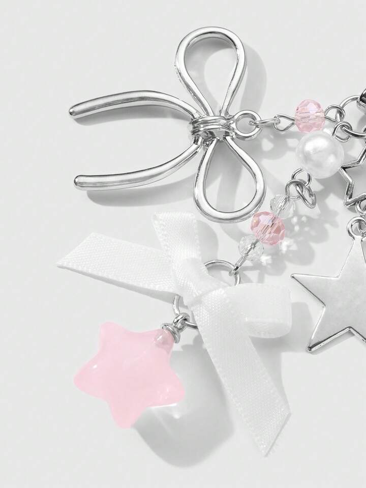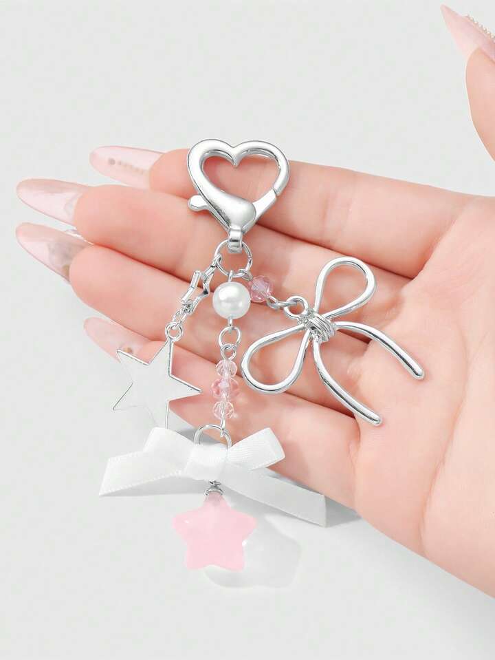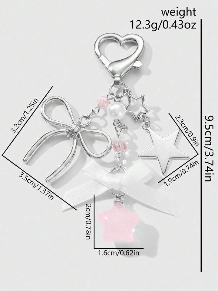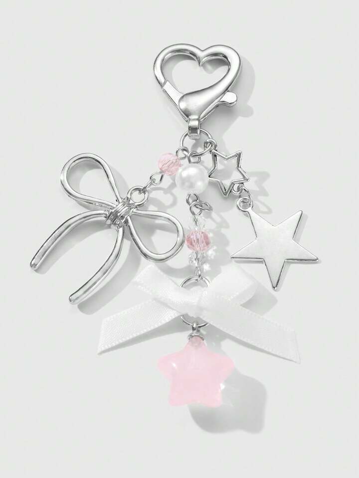 Kawaii 1 pezzo Stile Ins Ciondolo portachiavi elegante e carino per ragazze, in catena d'argento di alta qualità, con fiocco in nastro rosa, perle finte e stella in acrilico, adatto per donne e ragazze, per uso quotidiano e regalo per San Valentino