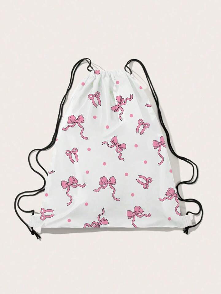 Kawaii 1 pezzo Zaino con coulisse alla moda con stampa fiocco rosa, zaino per pendolari all'aperto, per la scuola