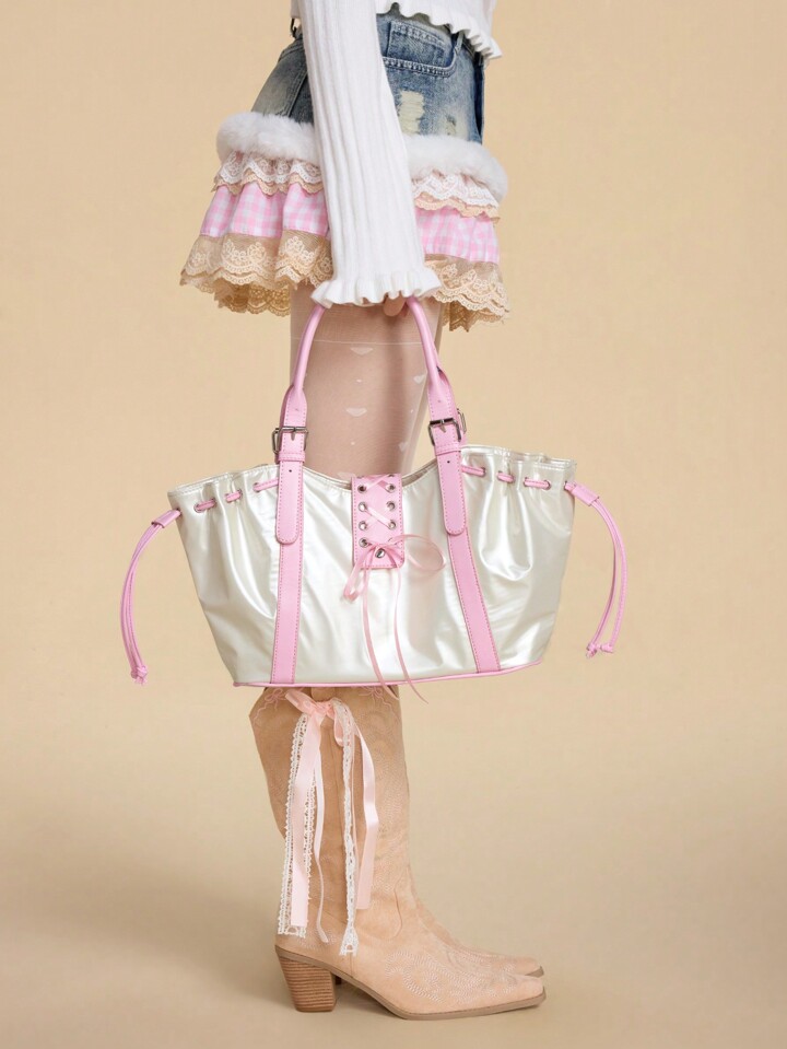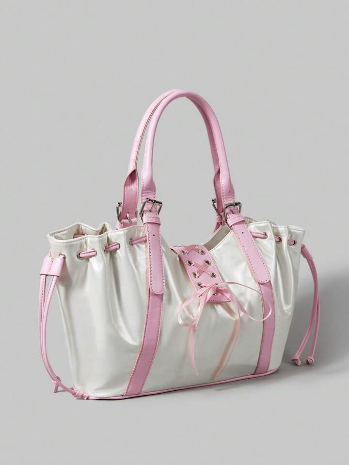 Kawaii 1 pezzo di Borsa a spalla rosa perlescente e bianca con contrasto di colore, decorazione con fiocco, adatta per l uso quotidiano e per appuntamenti di San Valentino