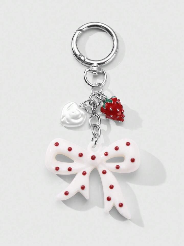 Kawaii 1 pezzo Portachiavi con catena d argento, perla e fiocco di fragola in acrilico, accessorio alla moda e versatile, adatto come regalo per donne e ragazze