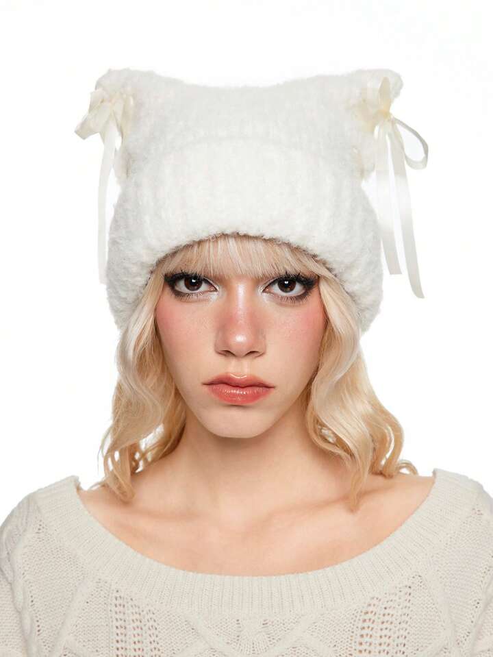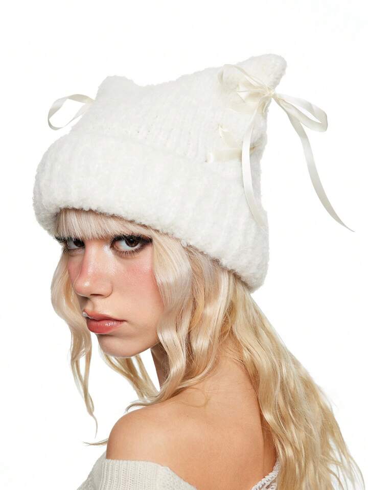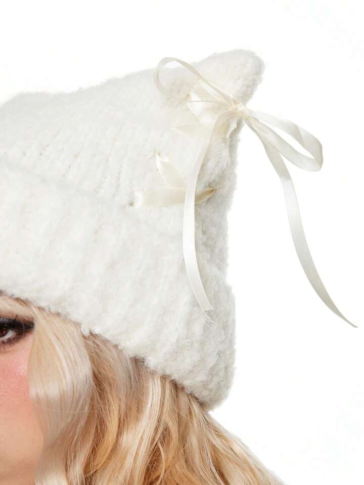 Kawaii 1 pezzo Berretto a maglia semplice di colore unito, casual, con fiocco, per donna, invernale