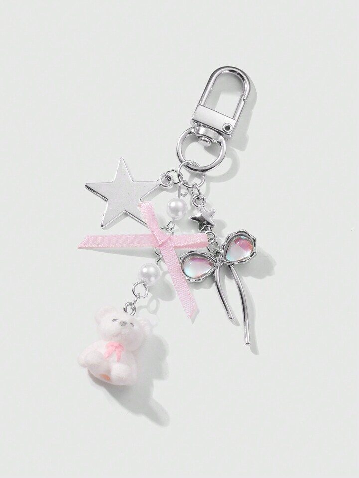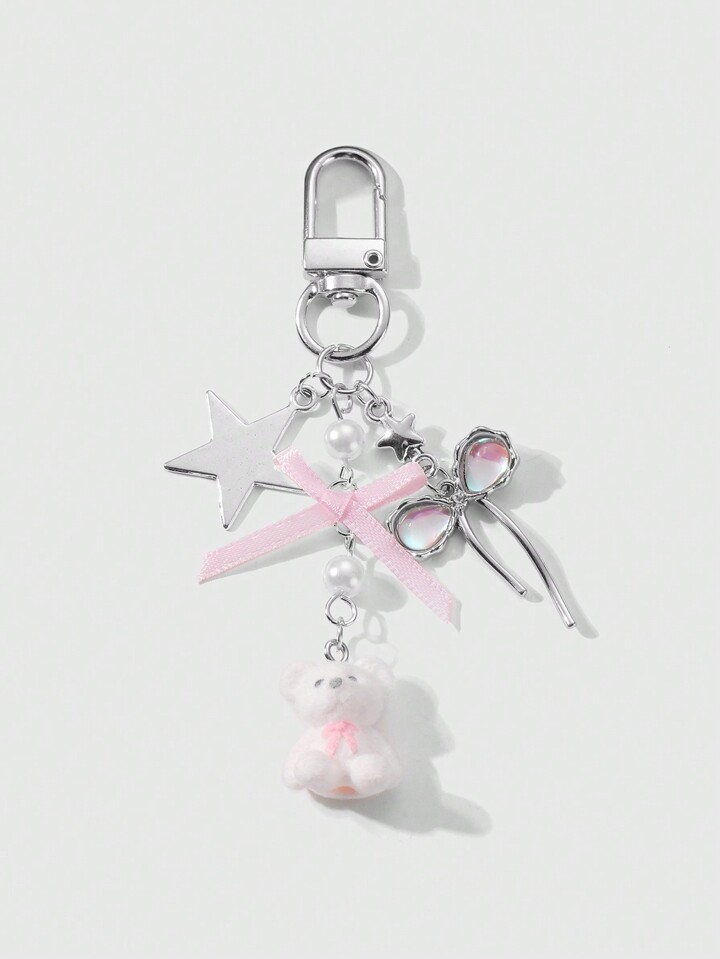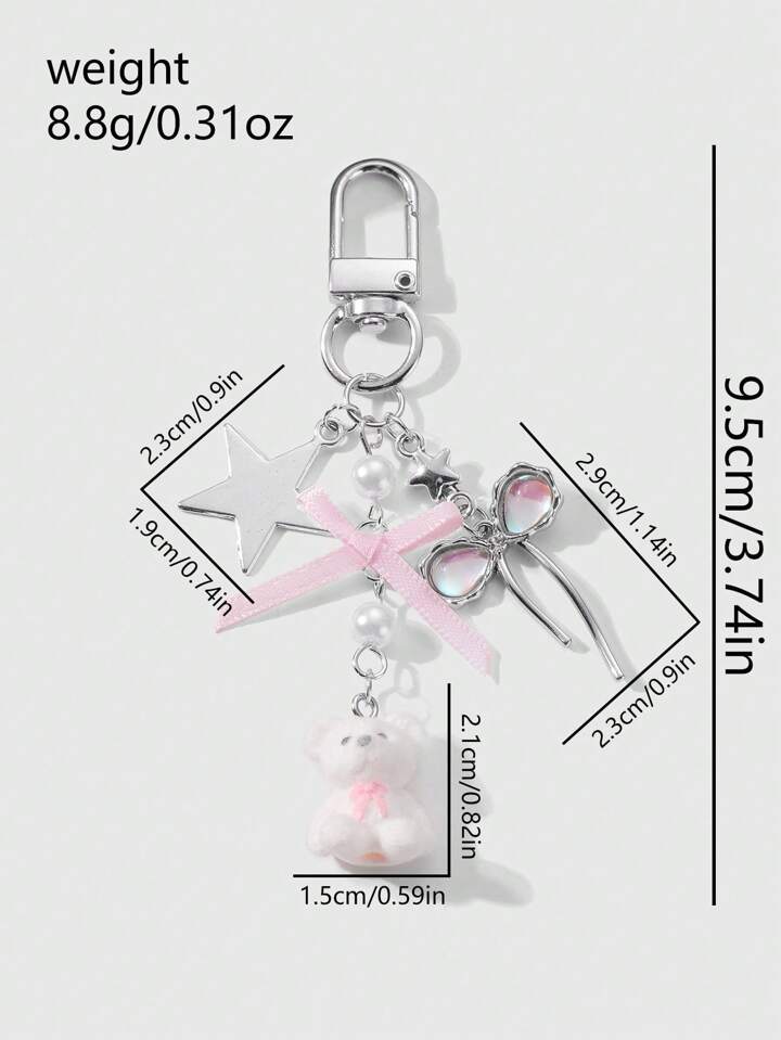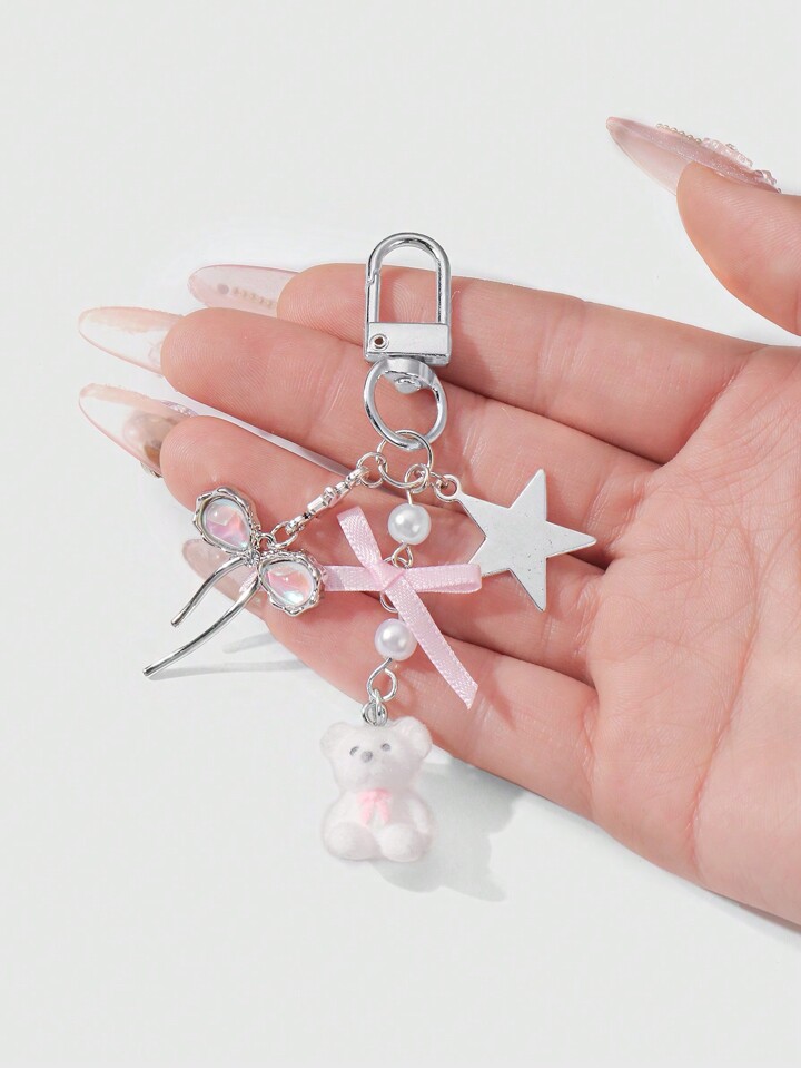 Kawaii 1 pezzo Portachiavi ciondolo a forma di orsetto con catena argento, fiocco, strass e perle finte nello stile minimalista elegante di Y2K, adatto come accessorio quotidiano da donna o come regalo festivo