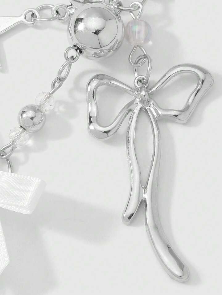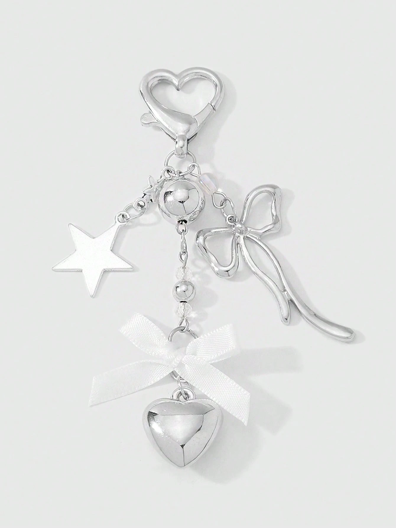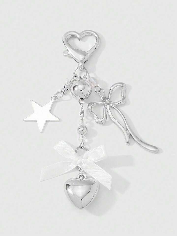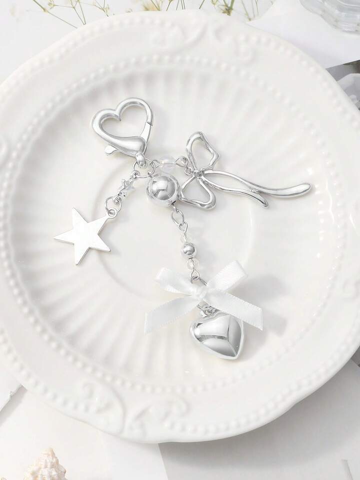 Kawaii 1 pezzo Portachiavi/ciondolo minimal in stile Y2K, in argento, con farfalla, perle finte, cuore cavo e fiocco intrecciato, adatto come accessorio per donne/ragazze per uso quotidiano o regalo per le vacanze