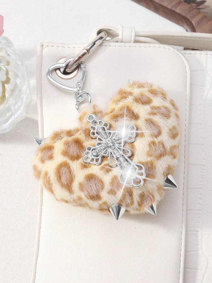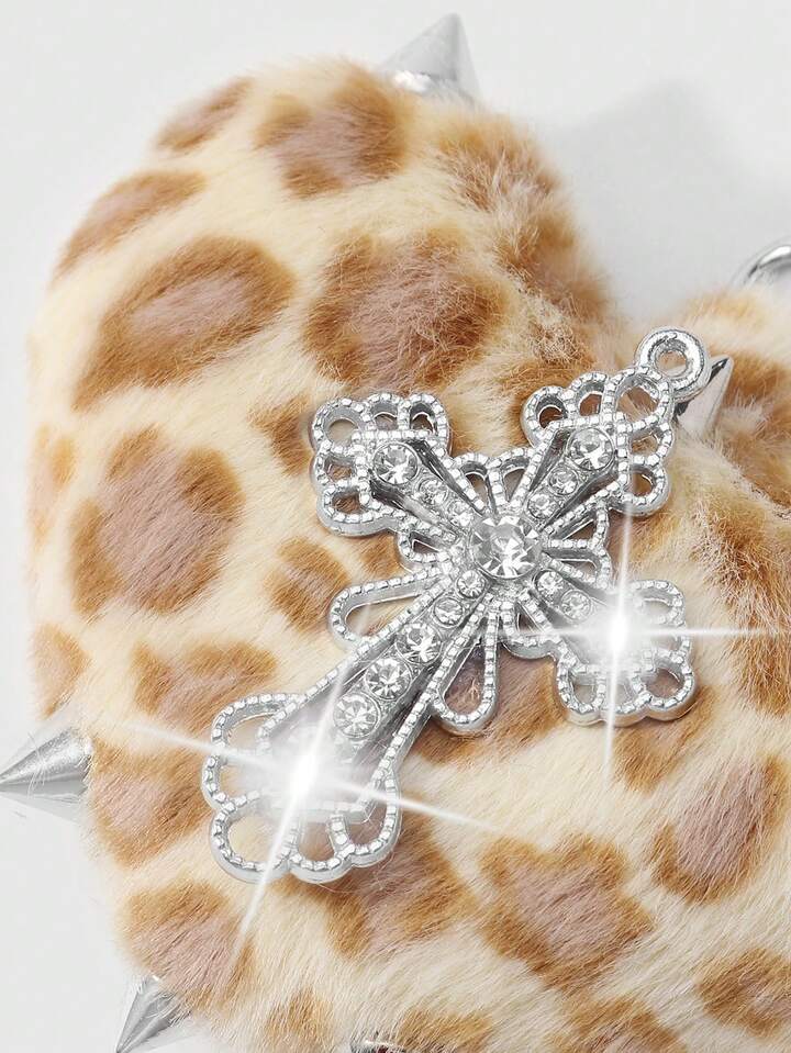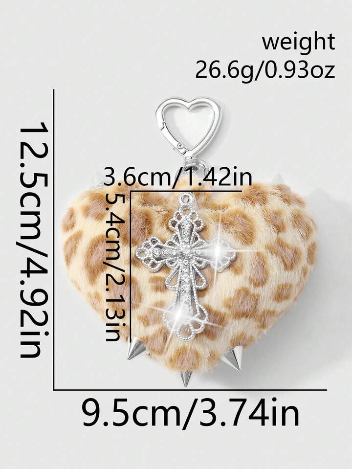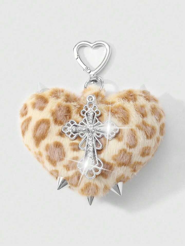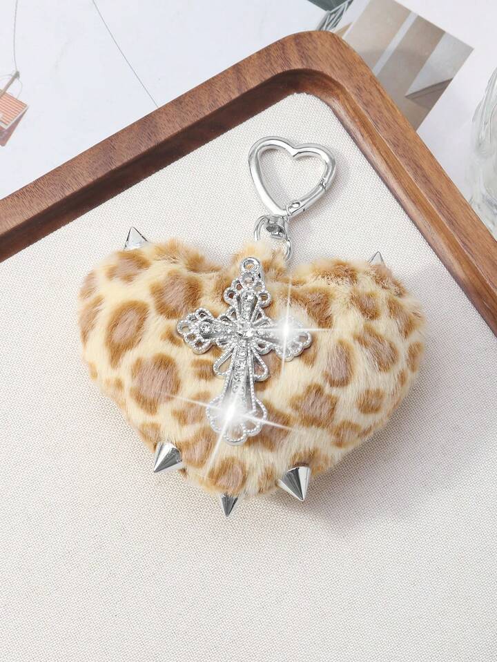 Kawaii 1 pezzo Portachiavi stile retrò Y2K punk goth, in finta pelliccia leopardata marrone con rivetti, pendente a cuore 3D e croce, adatto per donne, uso quotidiano o regalo, Ognissanti