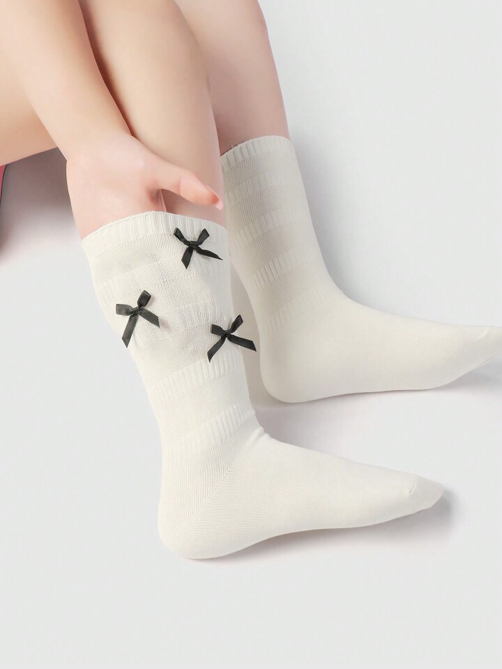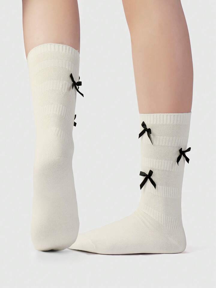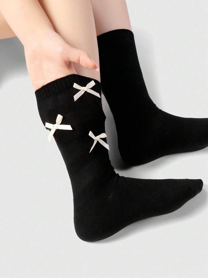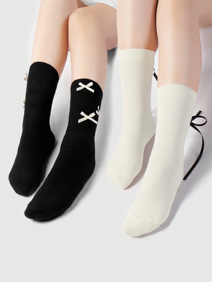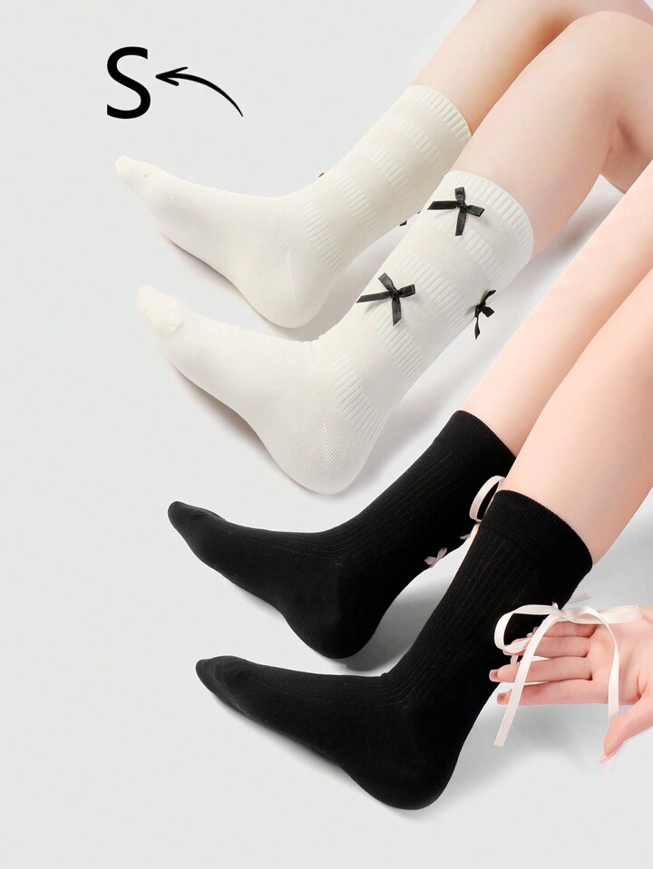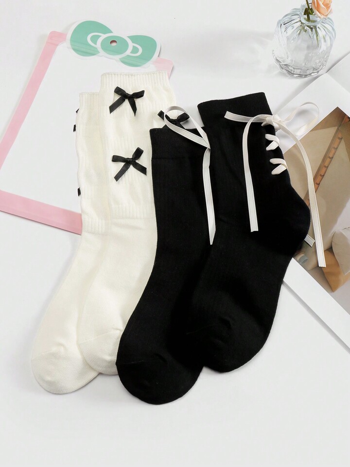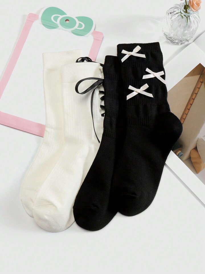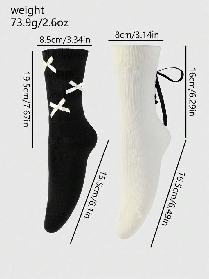 Kawaii 2 Paia di Calze Lunghe Alla Caviglia Stile Coreano Dolci Con Fiocco Di Nastro Bianco E Nero, Morbide E Calde, Adatte Per Donne, Set Combinato Per Uso Quotidiano, Confezionate In Una Scatola Regalo