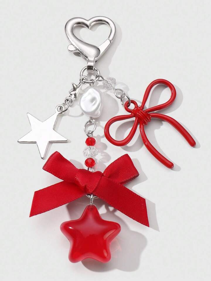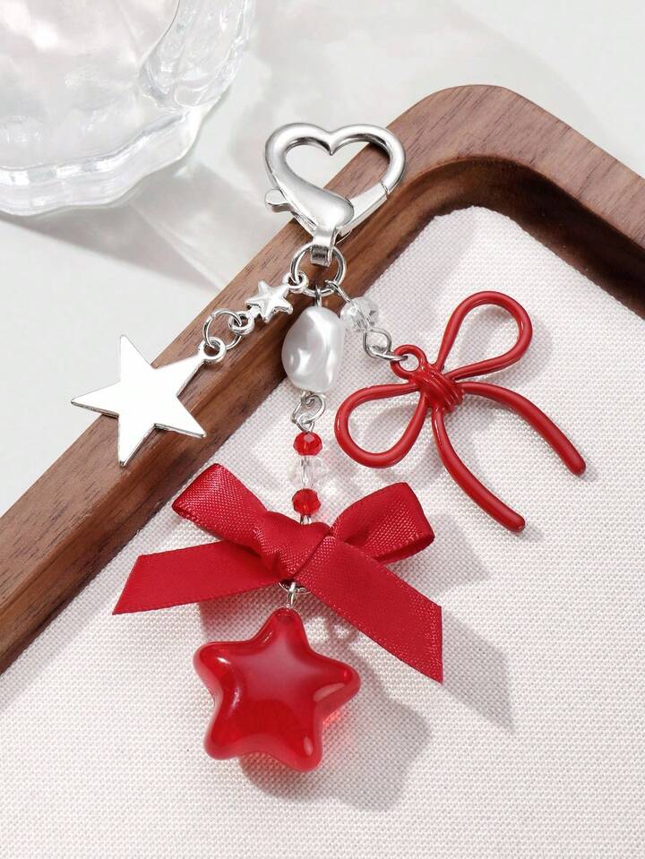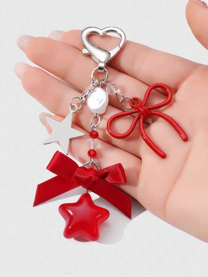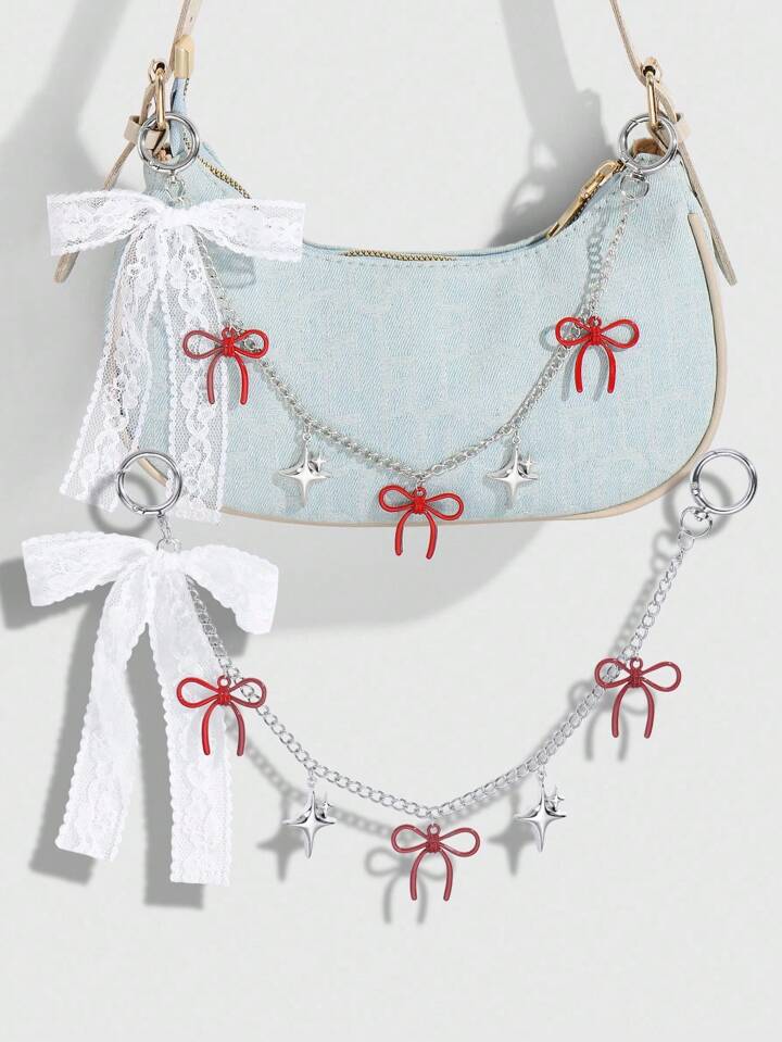 Kawaii 2 pezzi Set di portachiavi/pendenti eleganti e alla moda con farfalla in pizzo, catena a forma di stella e cuore in resina con farfalla rossa in pizzo, accessorio versatile e alla moda, idea regalo per donne