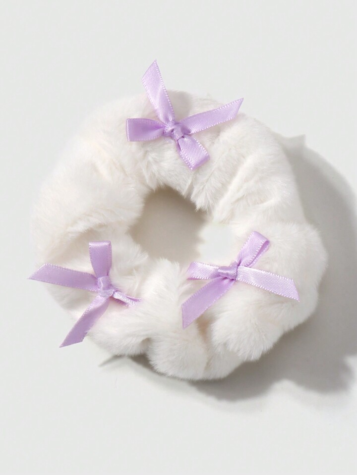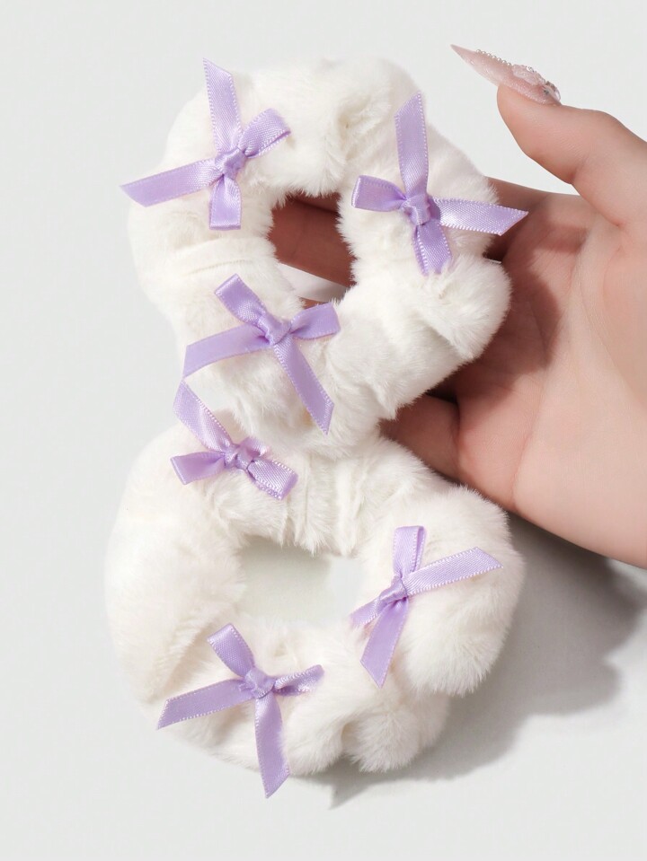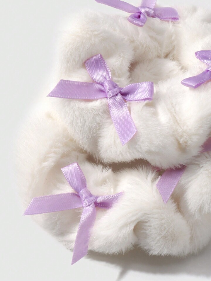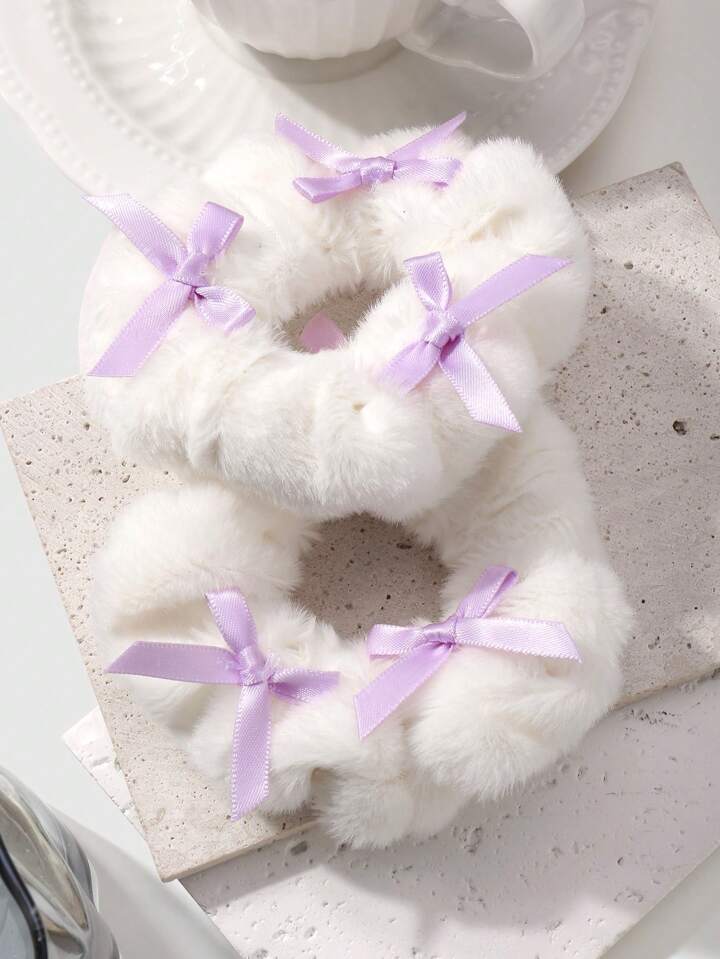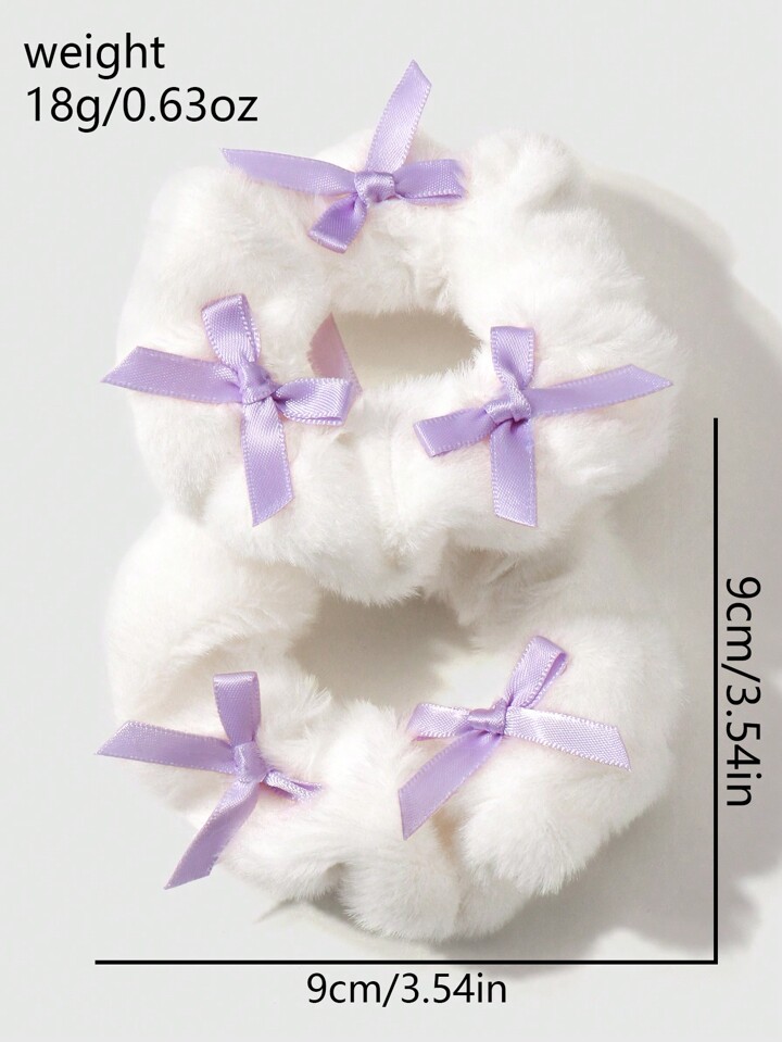 Kawaii 2 pezzi Set combinato di elastici per capelli in stile francese eleganti e versatili, in morbido peluche bianco e nastro viola, adatto per uso quotidiano di donne e ragazze, regalo perfetto per le feste