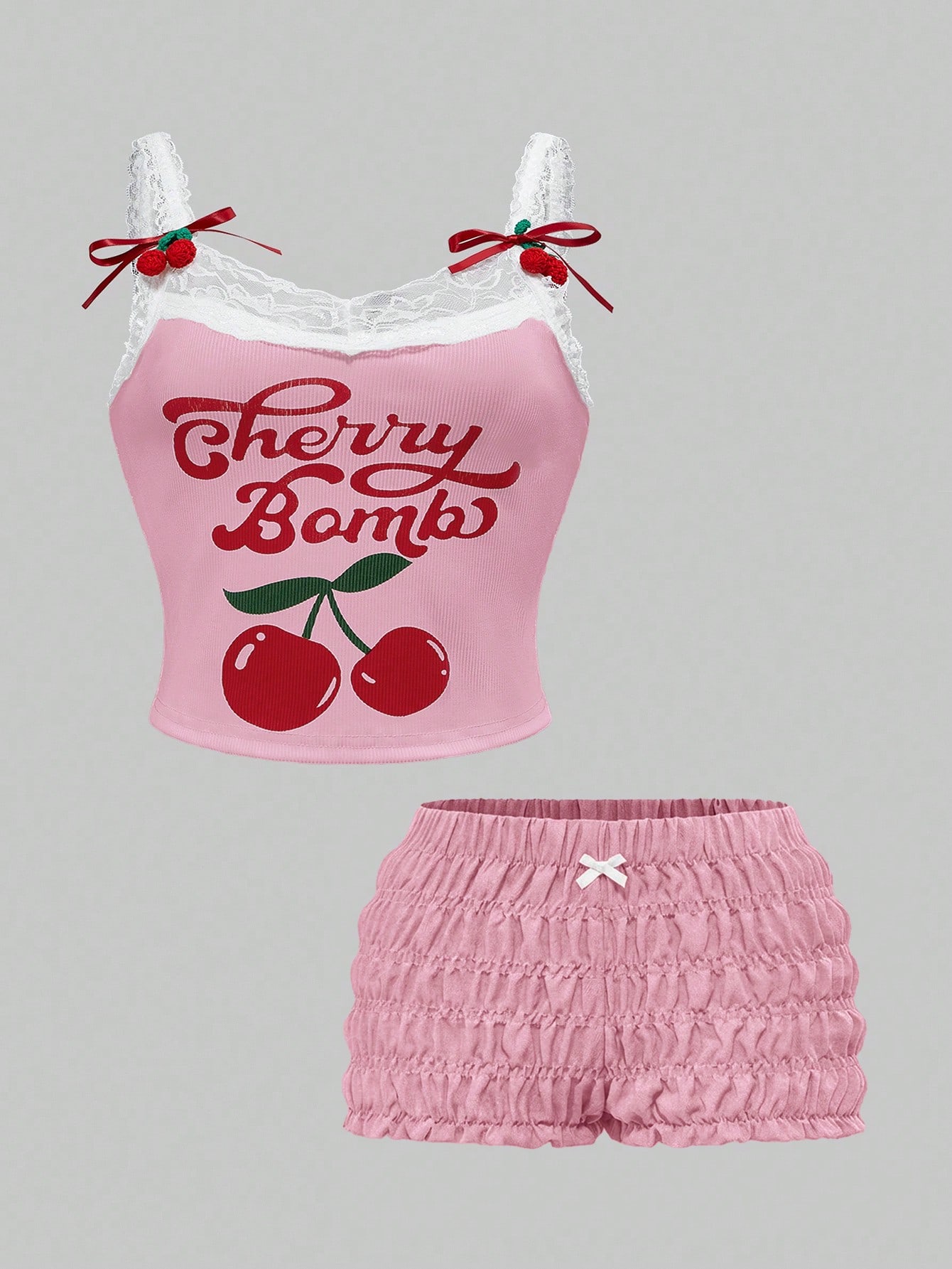 Kawaii 2 pezzi/set Top canotta casual con stampa di ciliegie e pizzo e pantaloncini arricciati per donne taglie forti