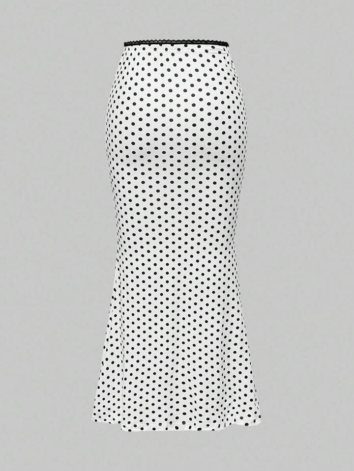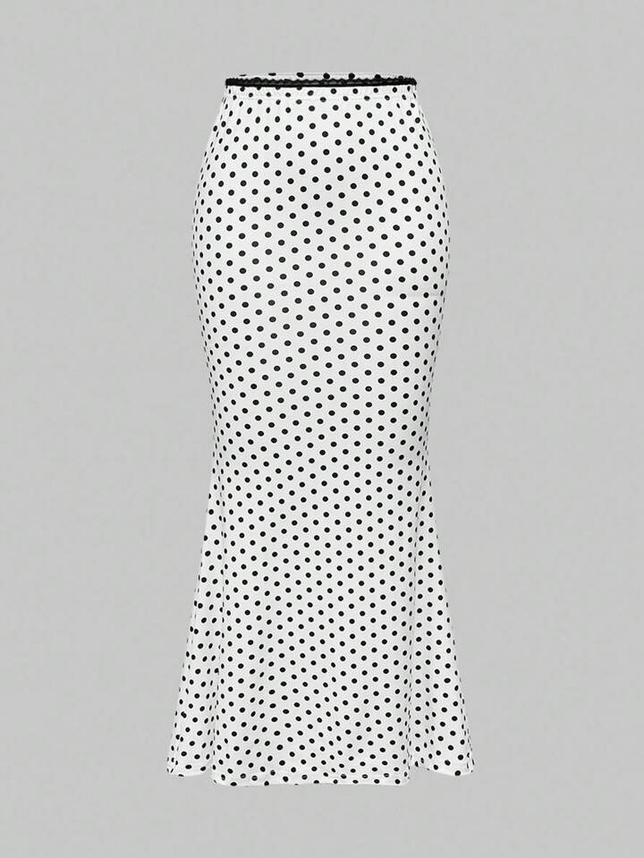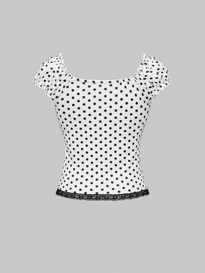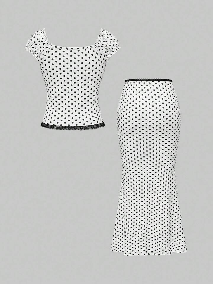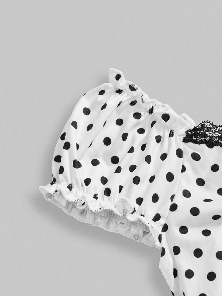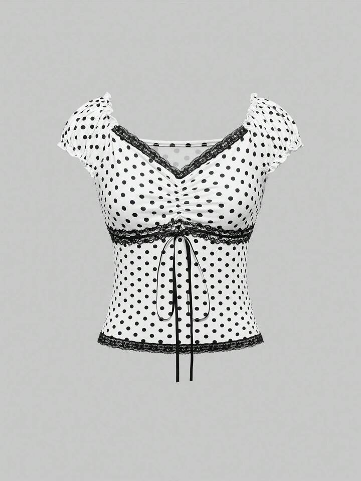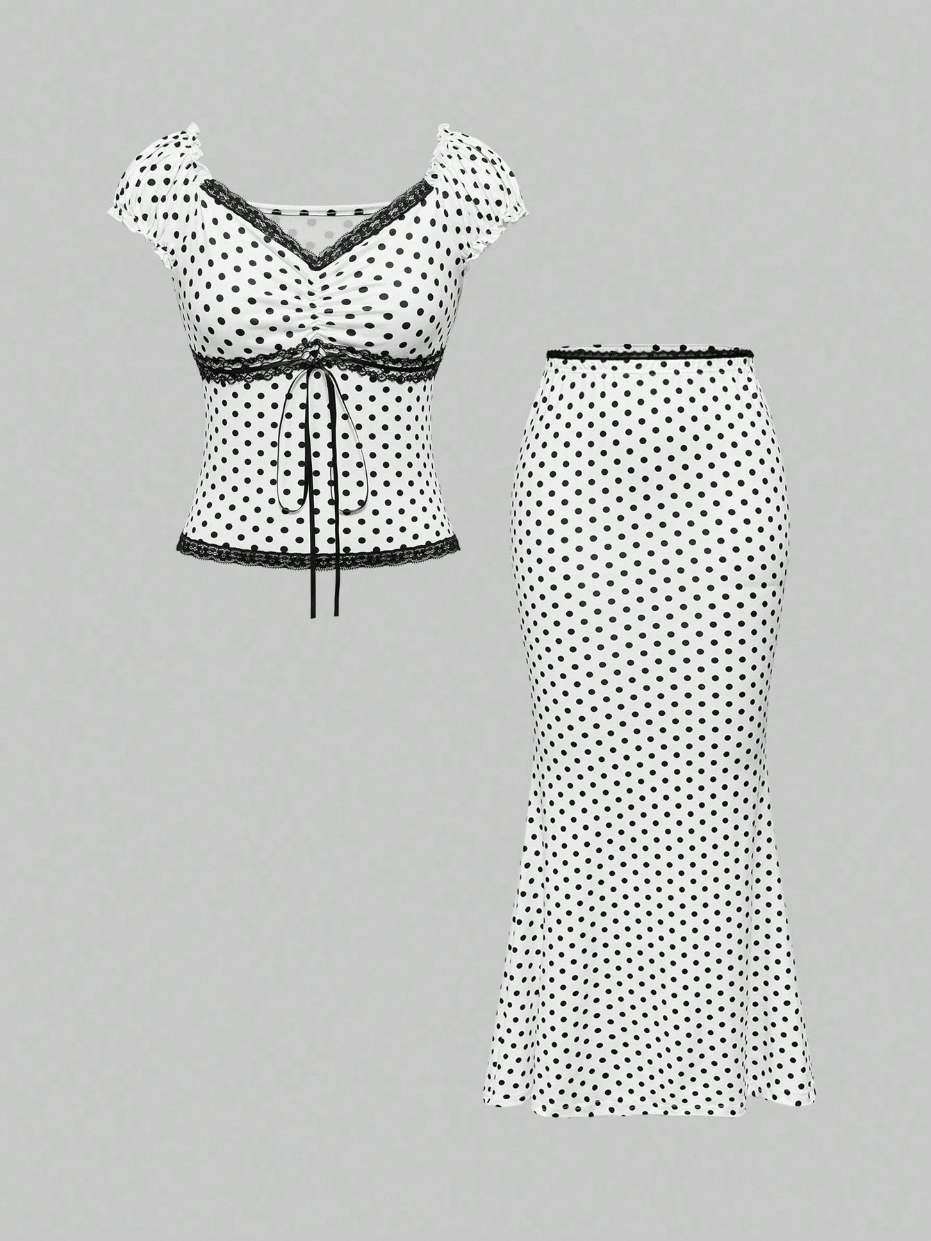 Kawaii 2 pezzi/set Blusa con scollo a V e decorazione fiocco, bianco e nero a pois, con inserti in pizzo, snellente e versatile + Minigonna