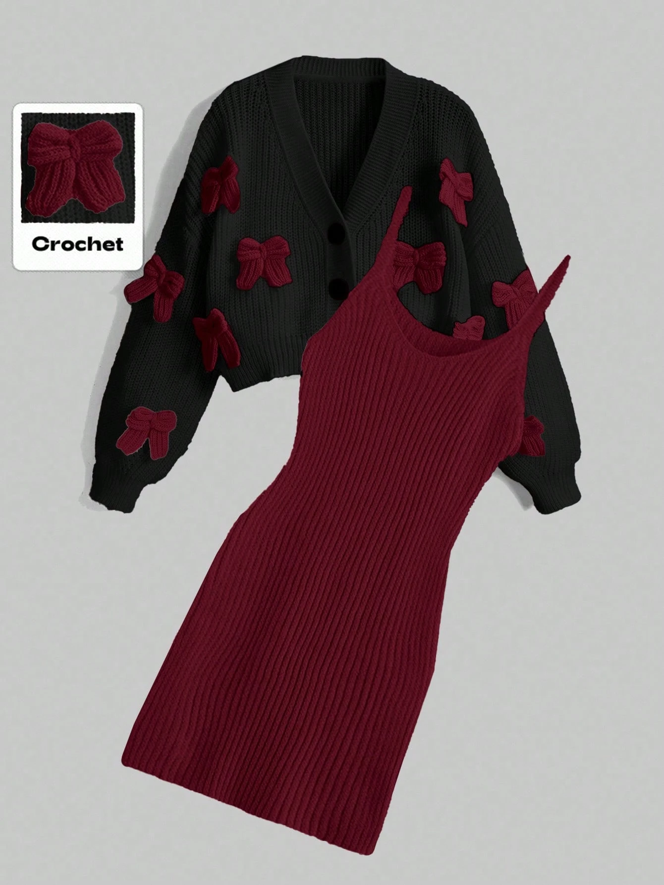 Kawaii 2 pezzi Set di cardigan lavorato a maglia con maniche a goccia e fiocco decorativo e vestito a sottoveste lavorato a maglia per donna