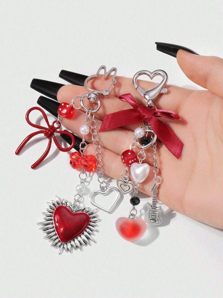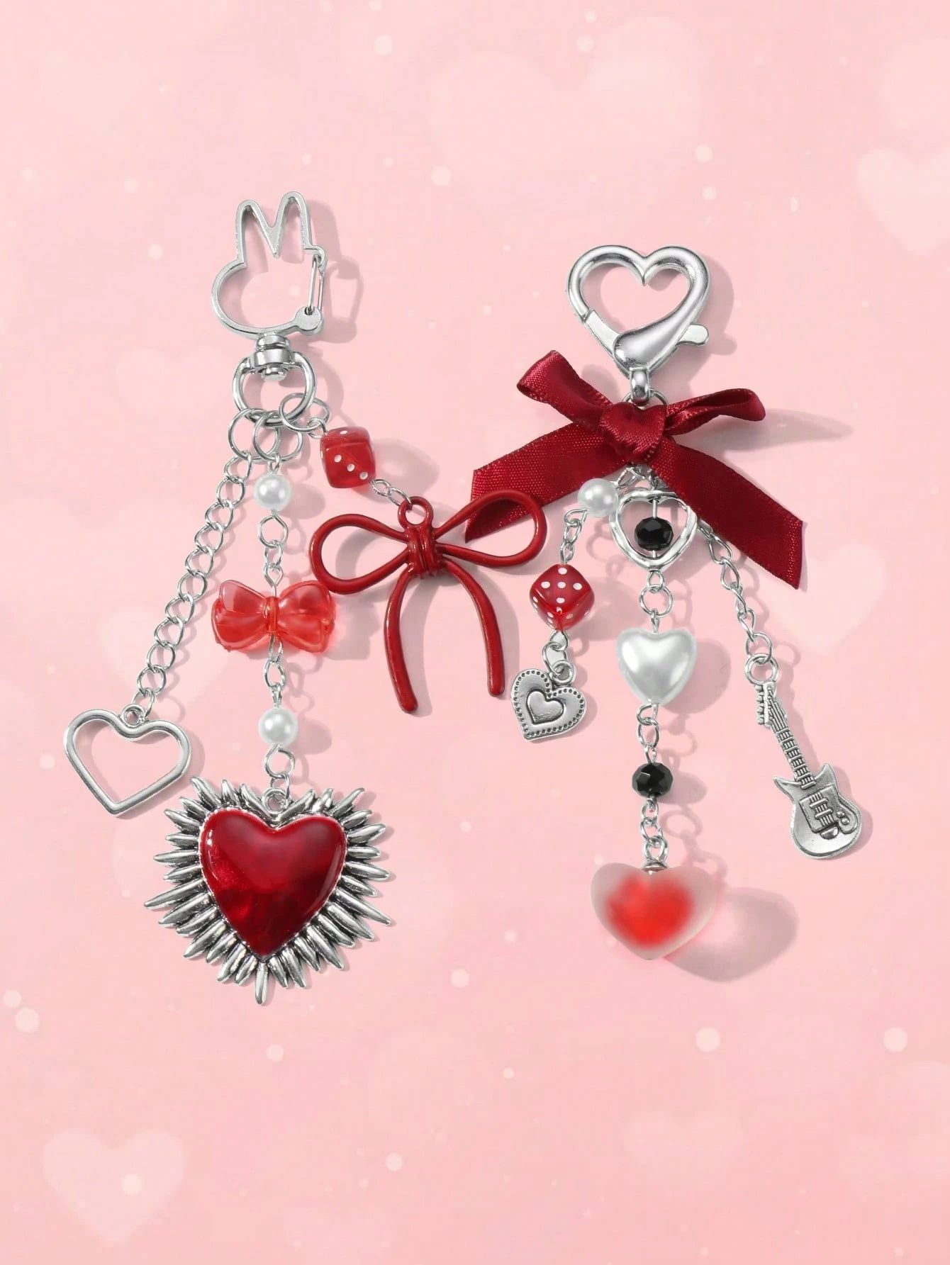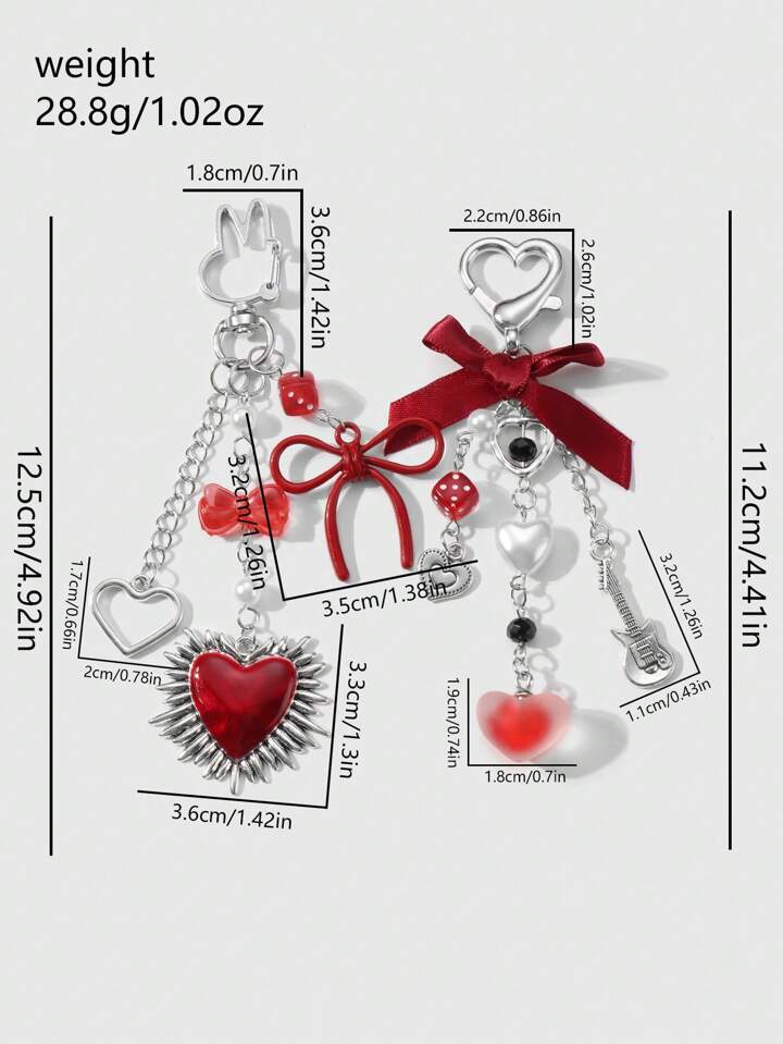 Kawaii 2 pezzi set di accessori alla moda in stile Y2K, ciondolo a forma di cuore in catena d'argento cava, perle finte rosse, nastrini e ciondoli a forma di chitarra cuore, adatti per donne/ragazze, uso quotidiano, regali di festival e San Valentino