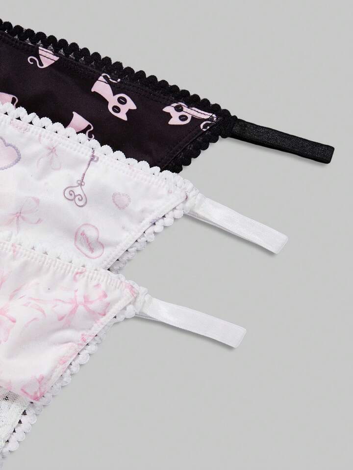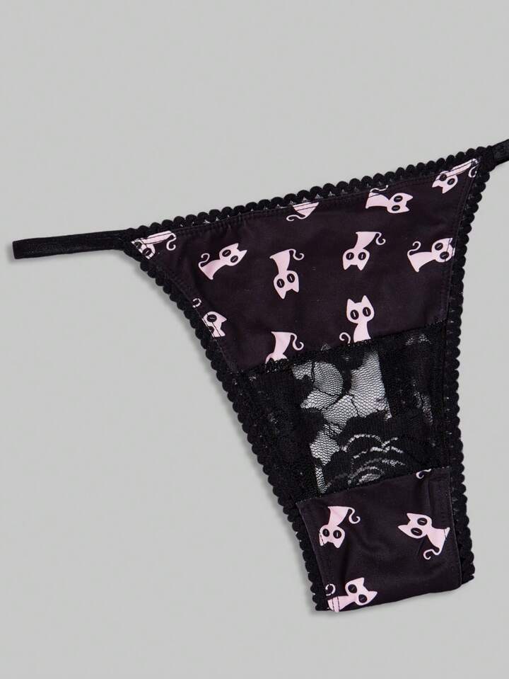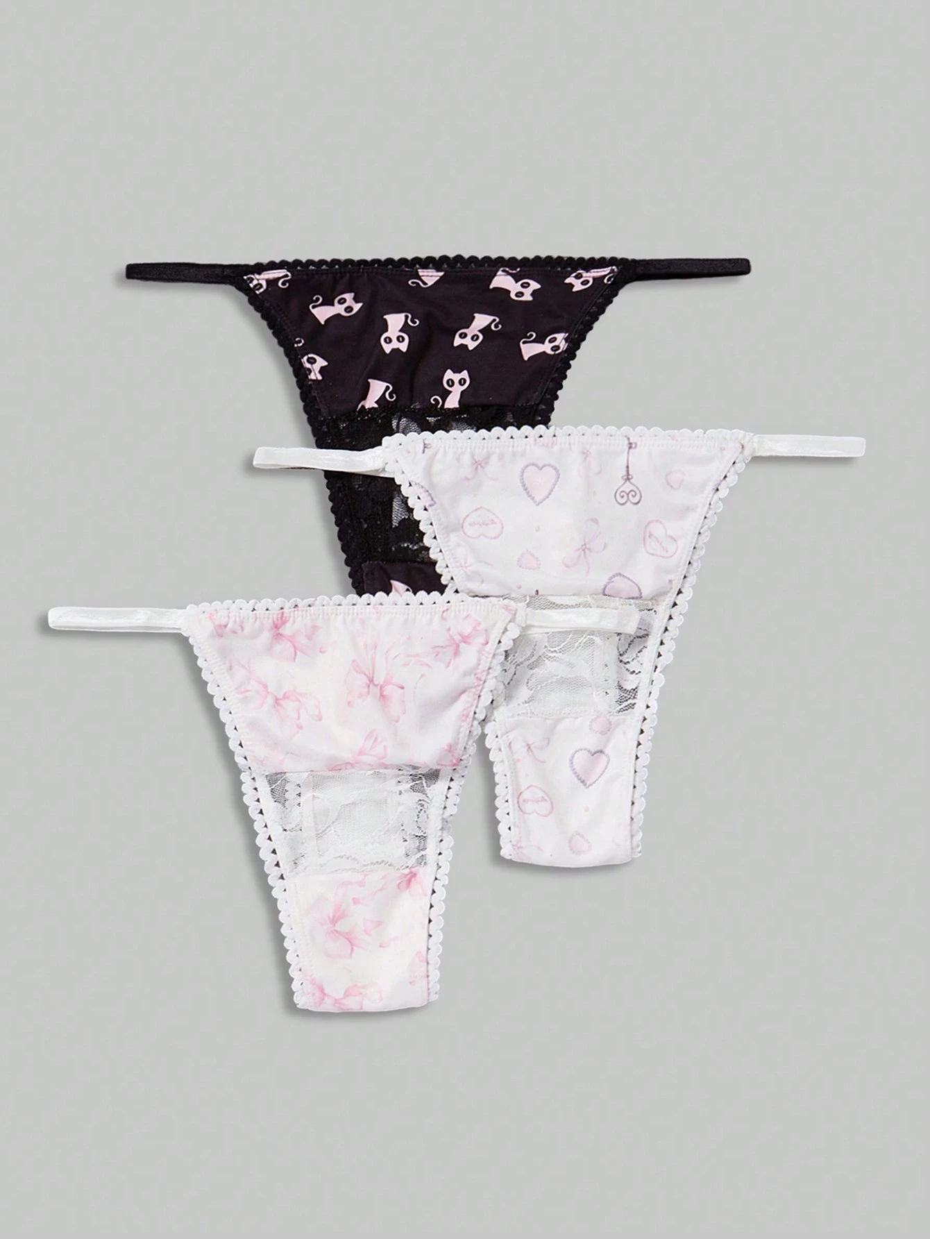 Kawaii 3 pezzi Perizoma in pizzo a contrasto con stampa fiocco, cuore e gatto