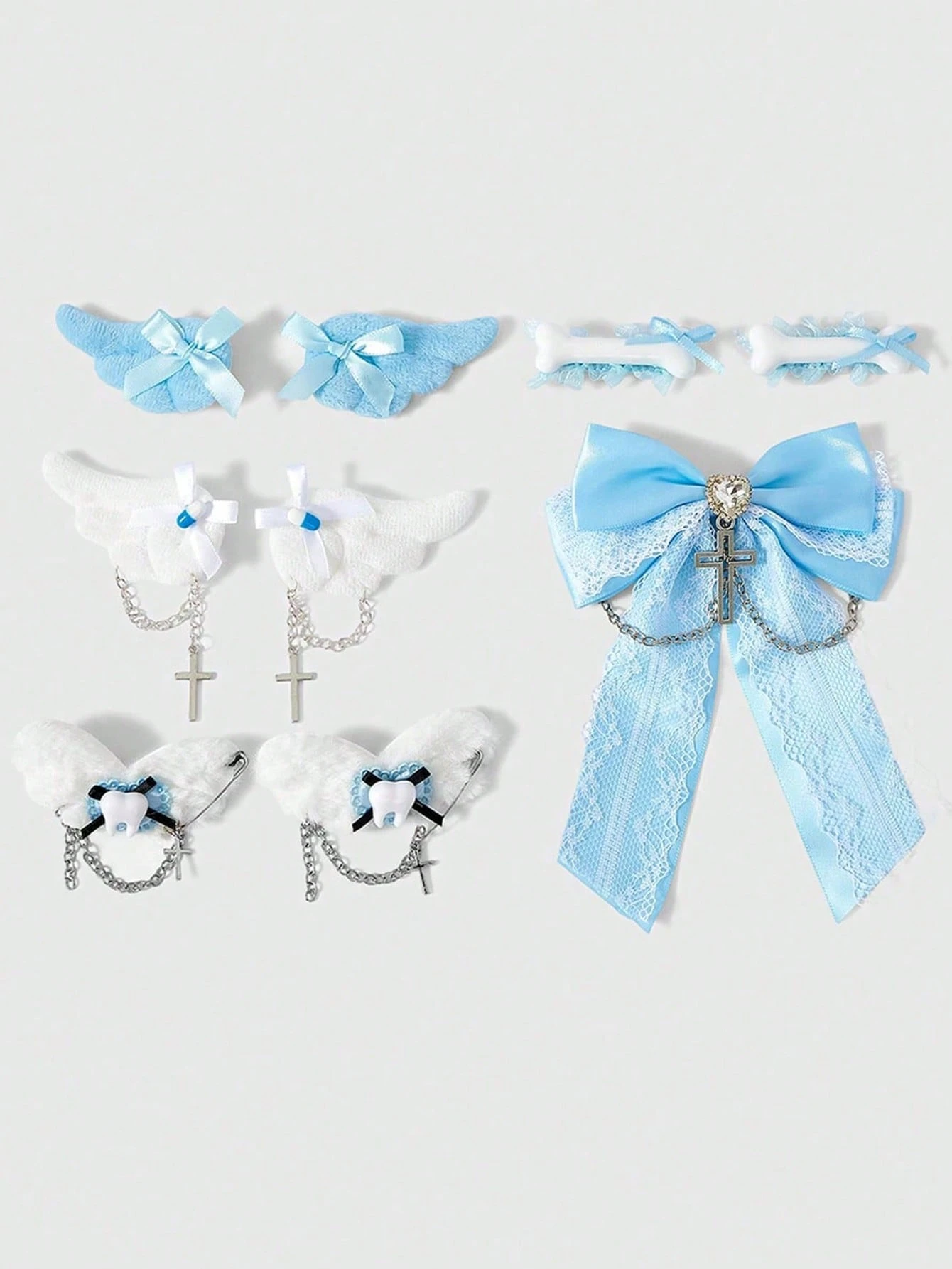 Kawaii 9 pezzi di fermagli per capelli a fiocco di stile carino casuale, fermagli per capelli con elementi a forma di ala e dente, accessori per capelli stile Lolita blu