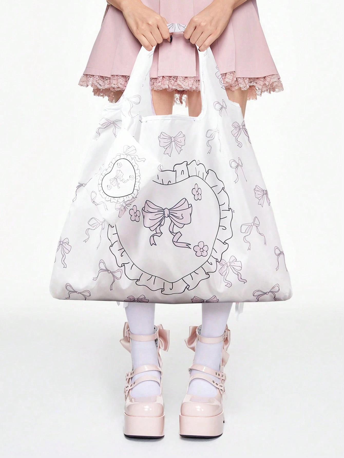 Kawaii Borsa shopper pieghevole di grande capacità con motivo in pizzo a fiocchi e cuori, con portamonete, 1419556