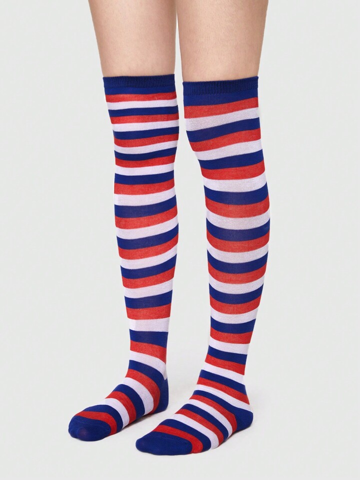 Kawaii Chaussettes Pour Femmes Hautes Jusqu'aux Genoux À Trois Rayures Bleu, Rouge Et Blanc