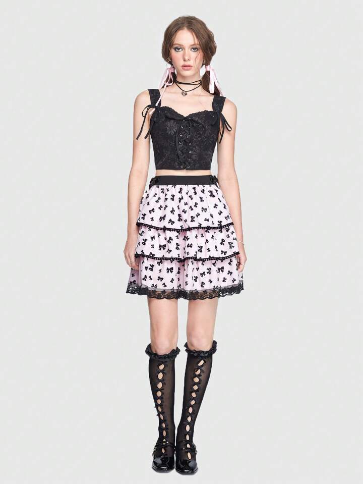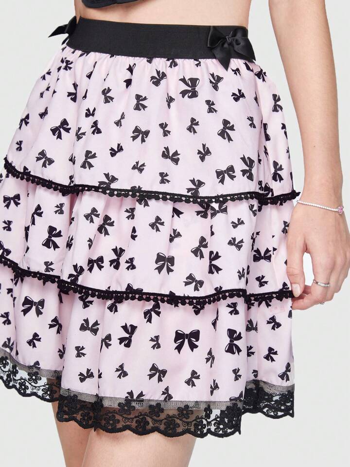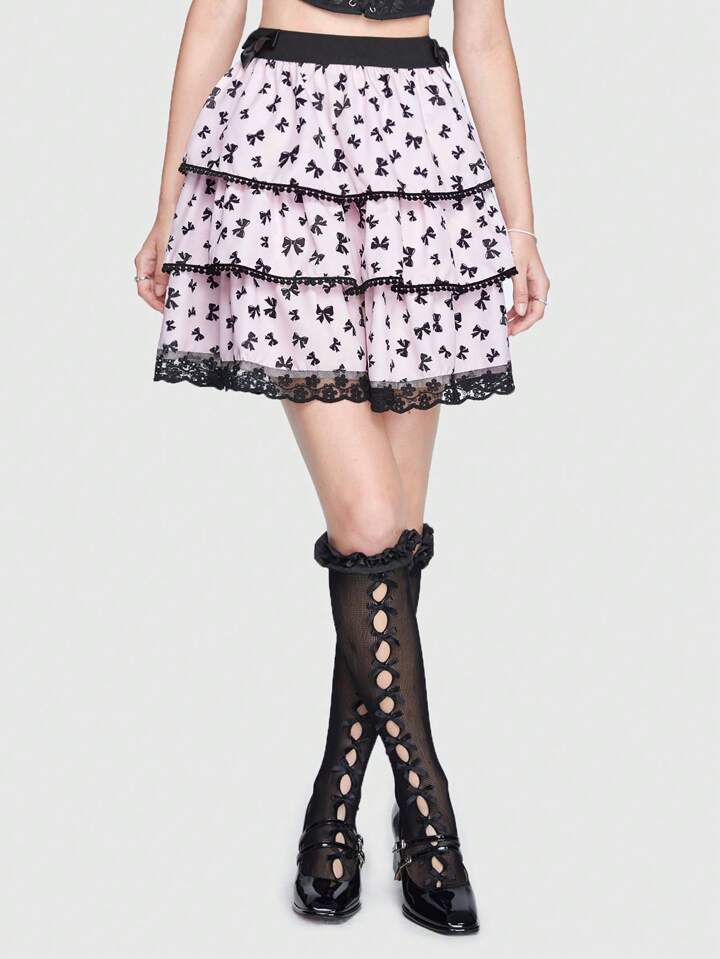 Kawaii Gonne stampa con fiocco pizzo a contrasto orlo a strato