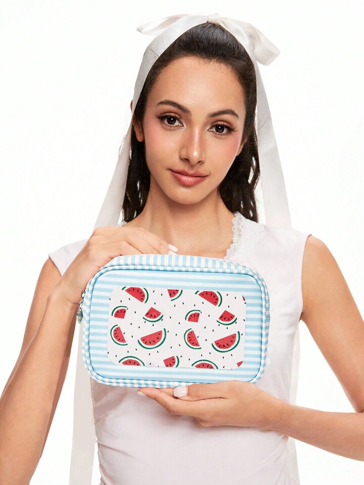 Kawaii Borsa da trucco portatile di grande capacità con stampa a cartone animato di anguria e finestra trasparente per donne, 225772