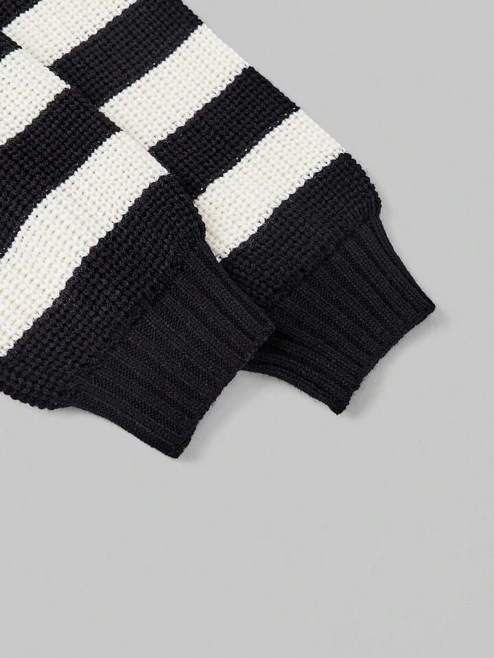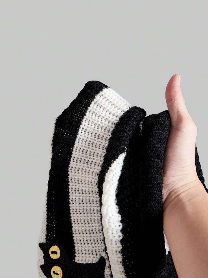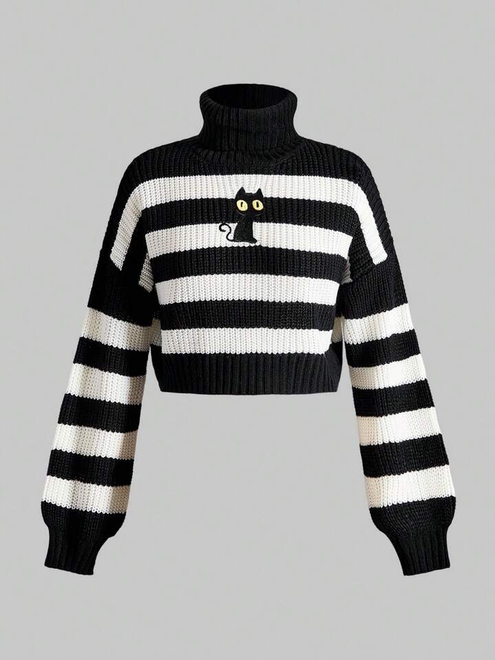 Kawaii Maglione a collo alto casual e carino con ricamo di gatto nero e righe per ragazze