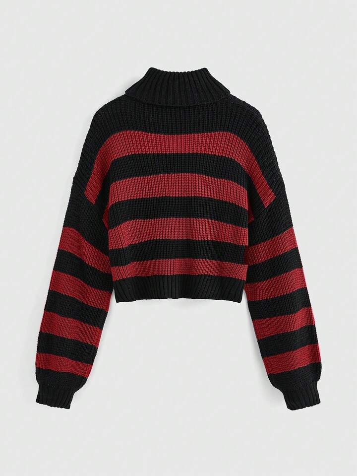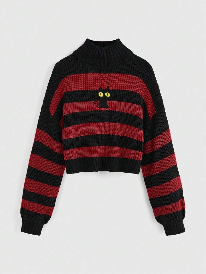 Kawaii Maglione a collo alto casual e carino con ricamo di gatto nero e righe per ragazze