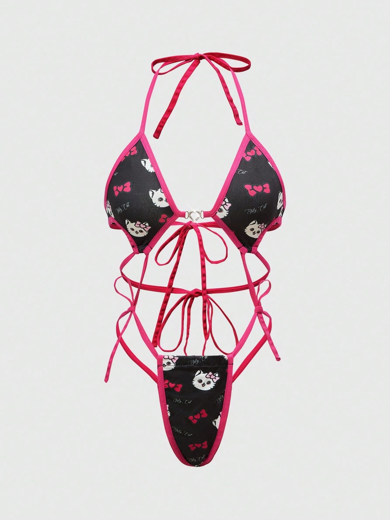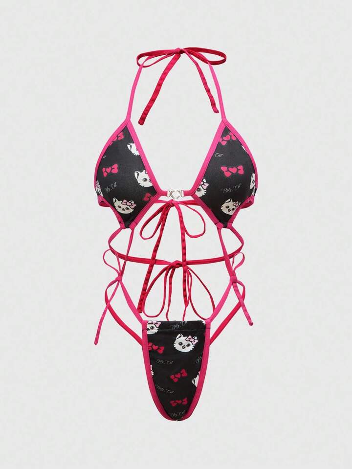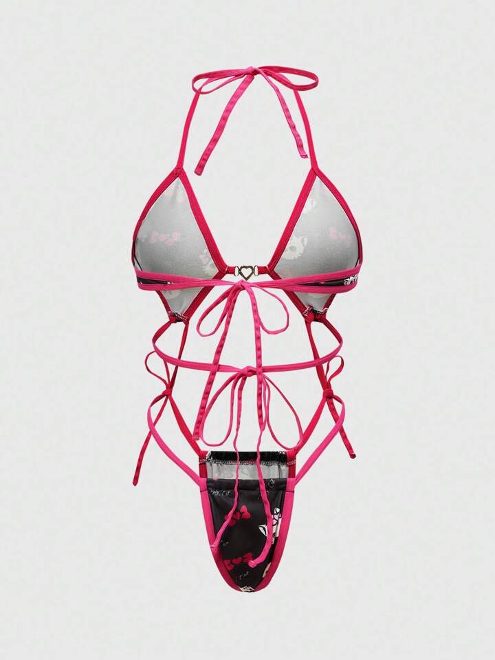 Body sexy da donna con stampa kawaii a forma di cuore e arco, con fiocco in metallo e lacci