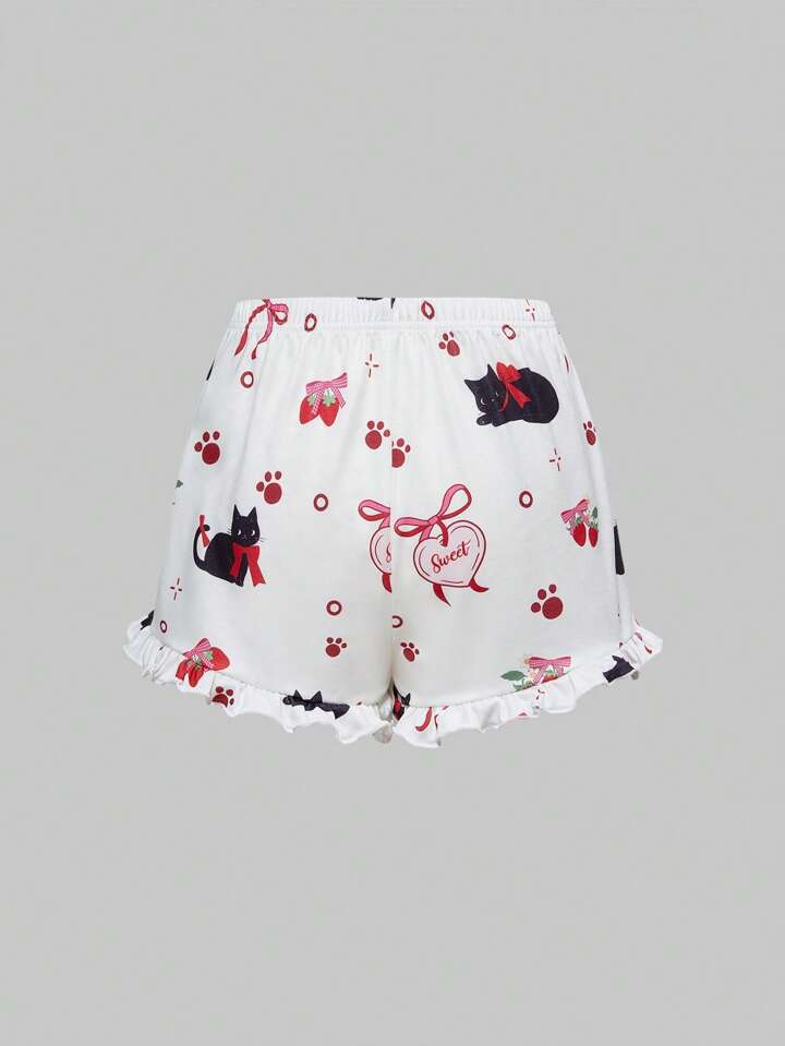 Completo da pigiama casual per donne estivo con camisetta con stampa gatto kawaii, balza e fiocco, e pantaloncini