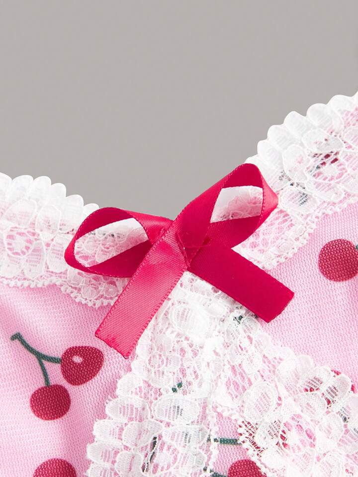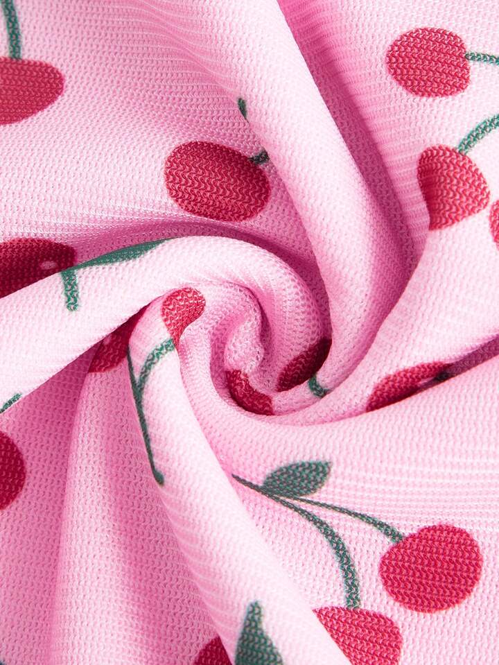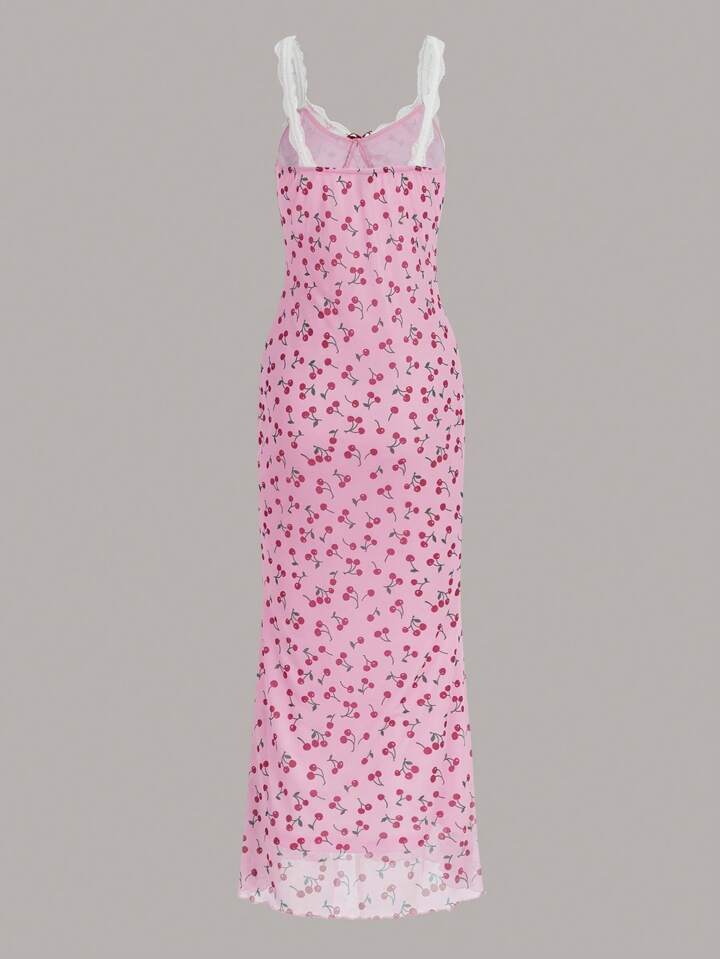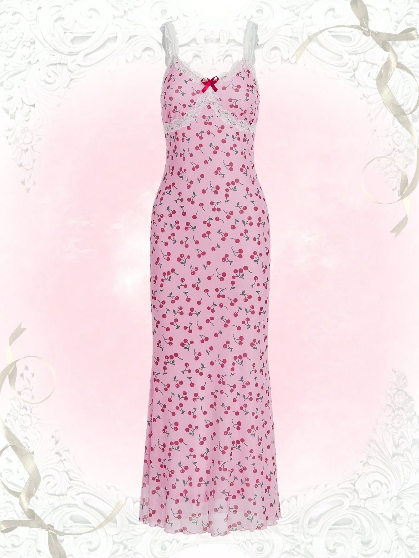 Kawaii Abito con bretelle sottile con stampa ciliegie pizzo a contrasto