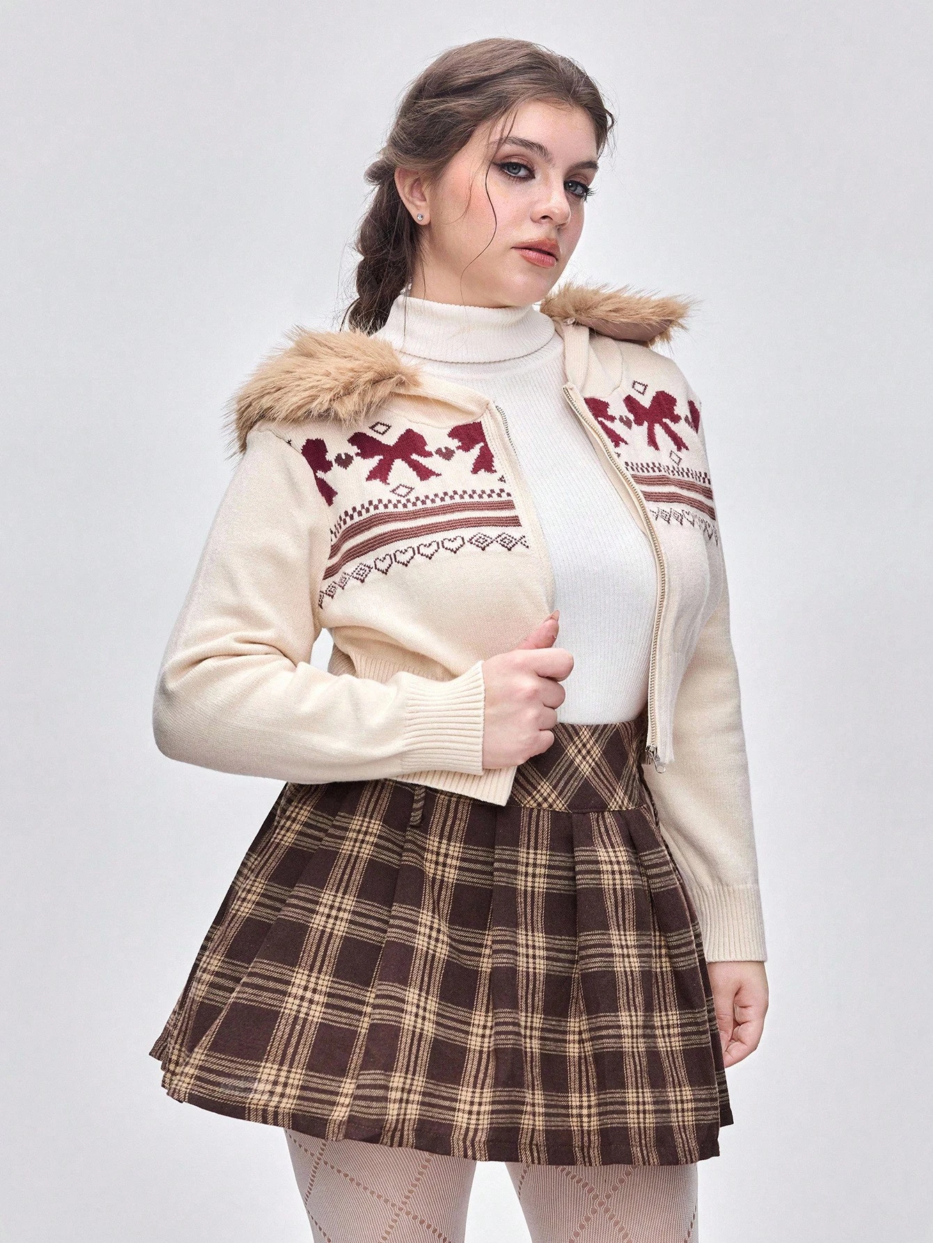 Kawaii Cardigan corto con colletto in pelliccia sintetica e motivo Fair Isle, adatto per l'inverno in taglie comode