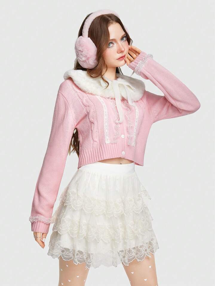 Kawaii Cardigan Con Collo Contrasto In Pelliccia Fuzzy, Dettagli In Pizzo E Bottoni