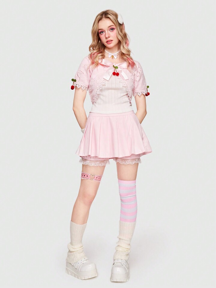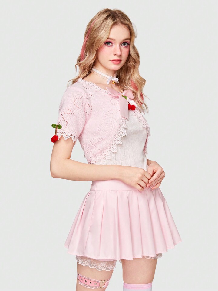 Kawaii Top corto pizzo a contrasto con manica a sbuffo fiocco frontale con volant