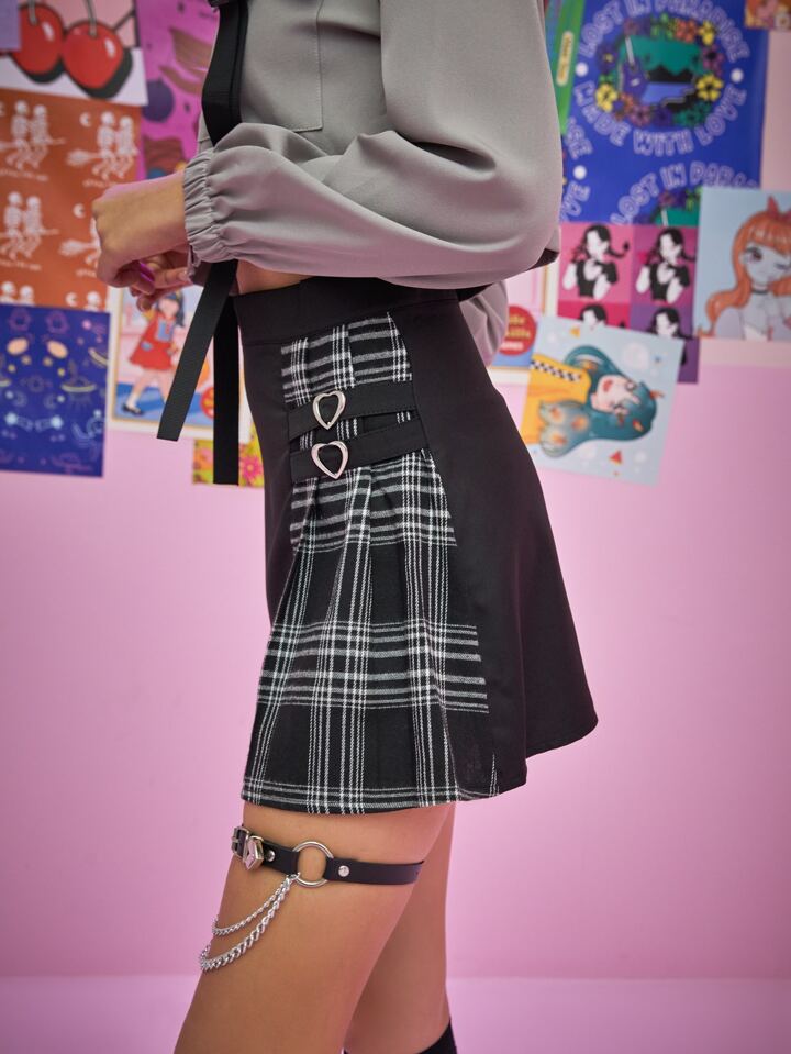 Kawaii Gonna plissettata a cuore quadri in contrasto