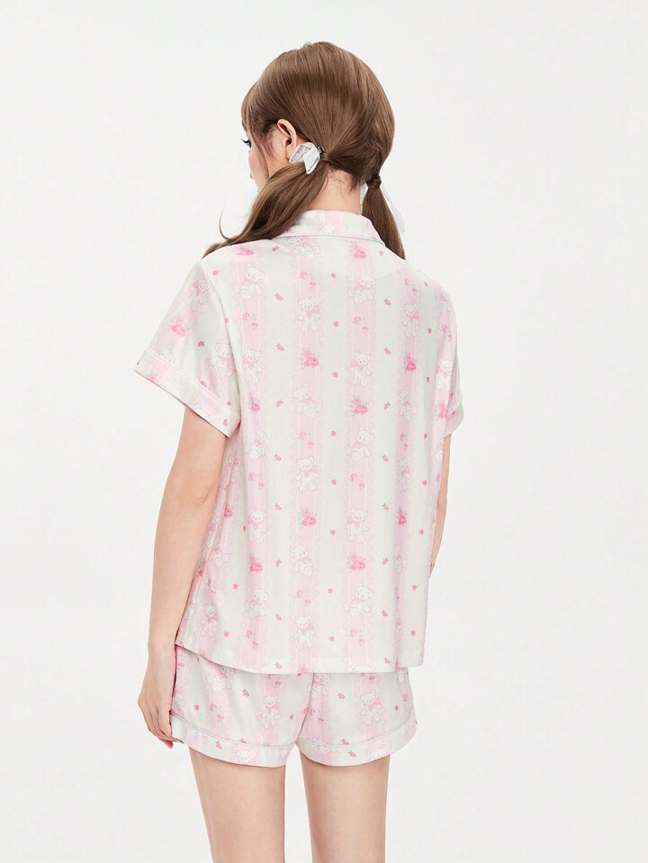 Kawaii Set di pigiama da donna con colletto alla coreana, maniche corte, con stampa all-over di orsetti, fiori e merletti, per la scuola