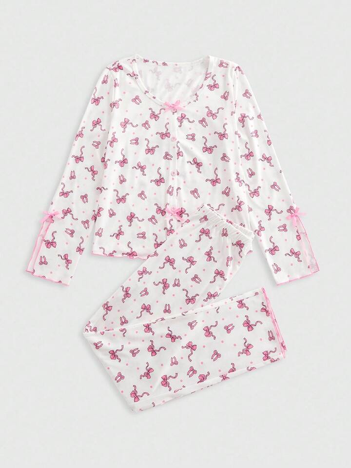 Kawaii Set pigiama da donna con maniche lunghe e pantaloni, con motivo carino a farfalle e pois