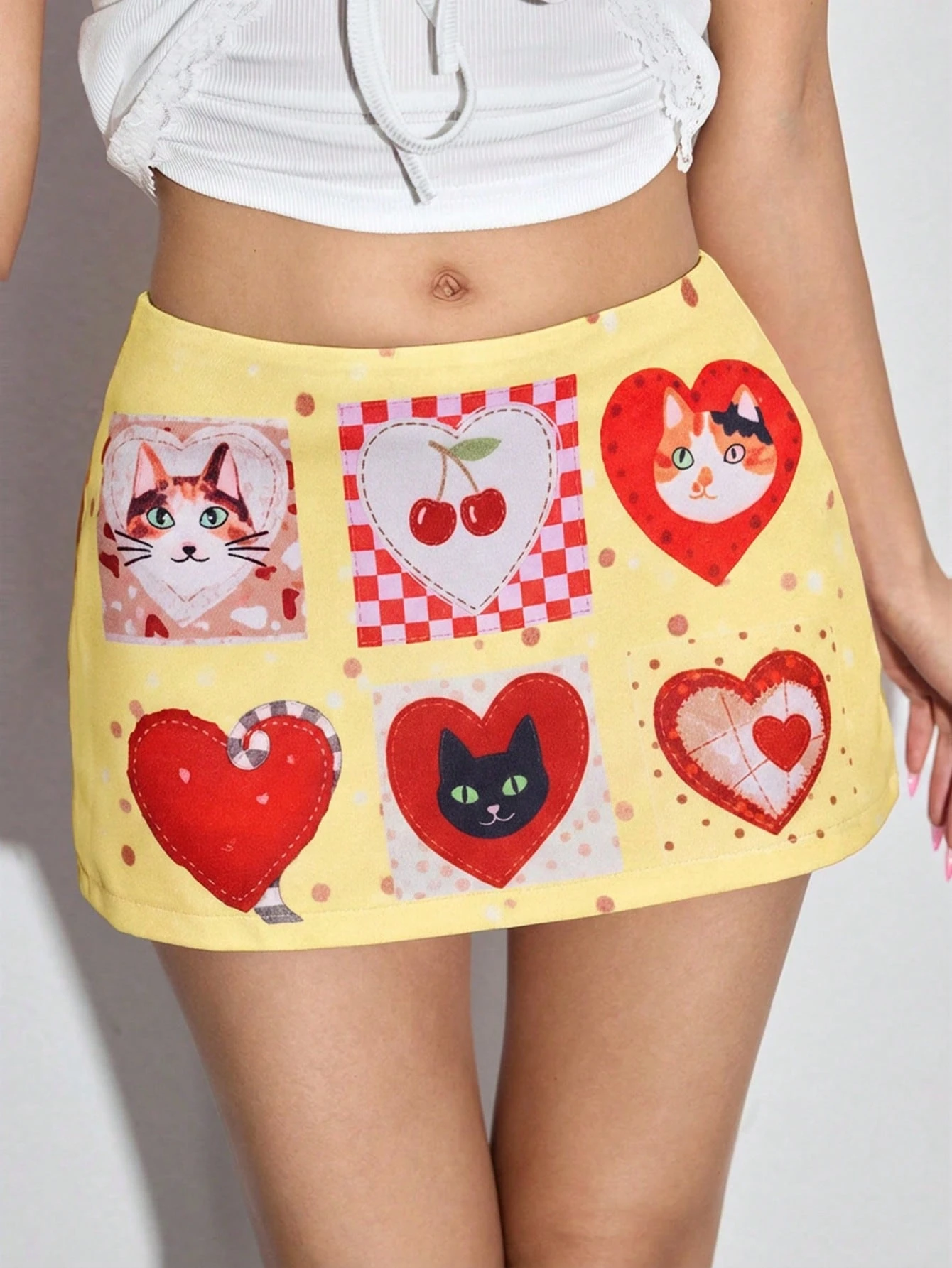 Kawaii Minigonna a vita ultra bassa con stampa a pois, cuori e gatti per donne