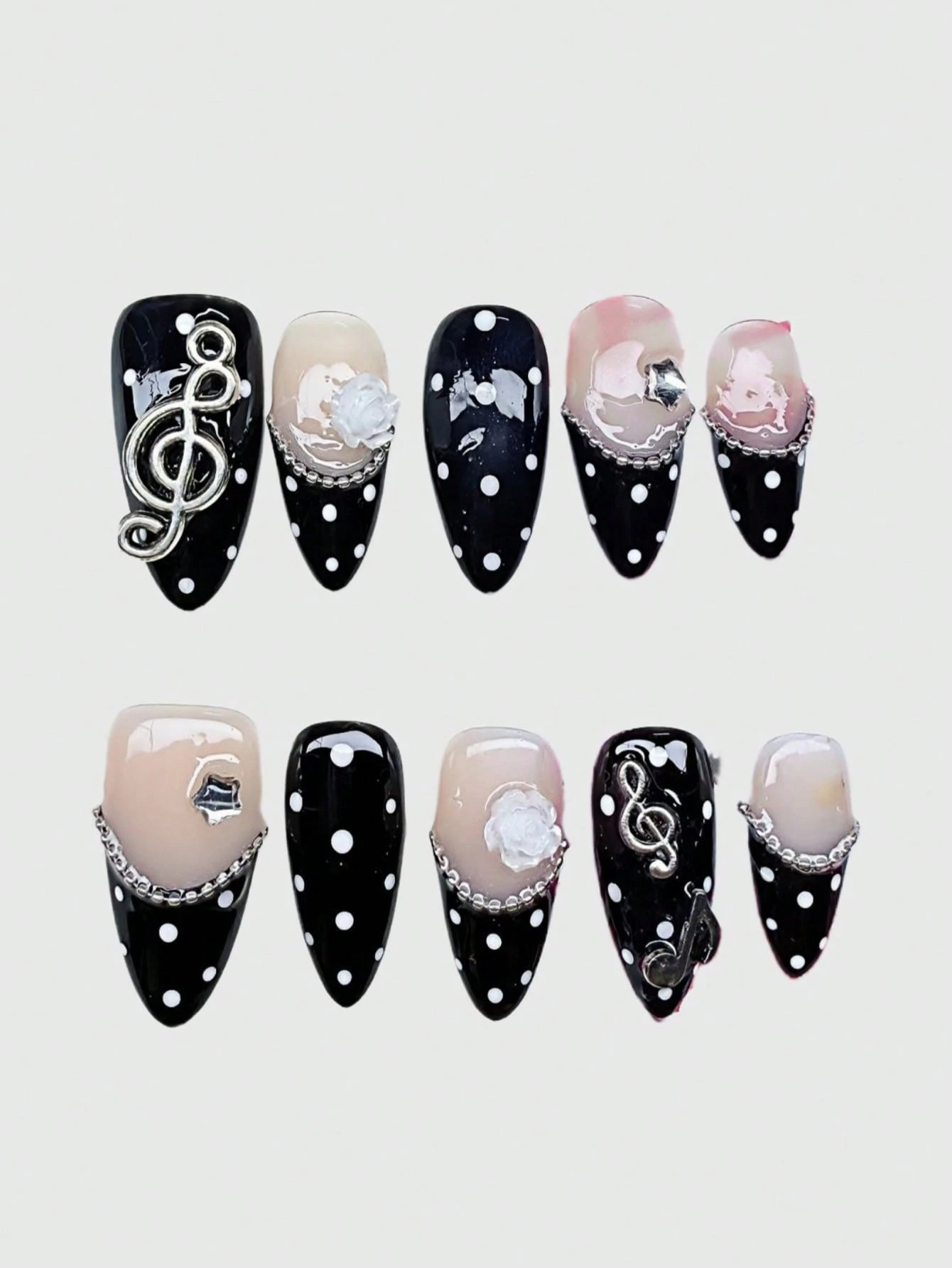 Kawaii Punte di unghie finte in stile ballerina con bordo in pizzo, fiocco romantico a forma di cuore, ali bianche in metallo e nota musicale rosa, prodotte in serie per un look energico da ragazza, adatte per uscite quotidiane e appuntamenti