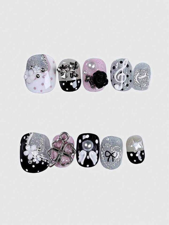 Kawaii Punte di unghie finte in stile ballerina con bordo in pizzo, fiocco romantico a forma di cuore, ali bianche in metallo e nota musicale rosa, prodotte in serie per un look energico da ragazza, adatte per uscite quotidiane e appuntamenti