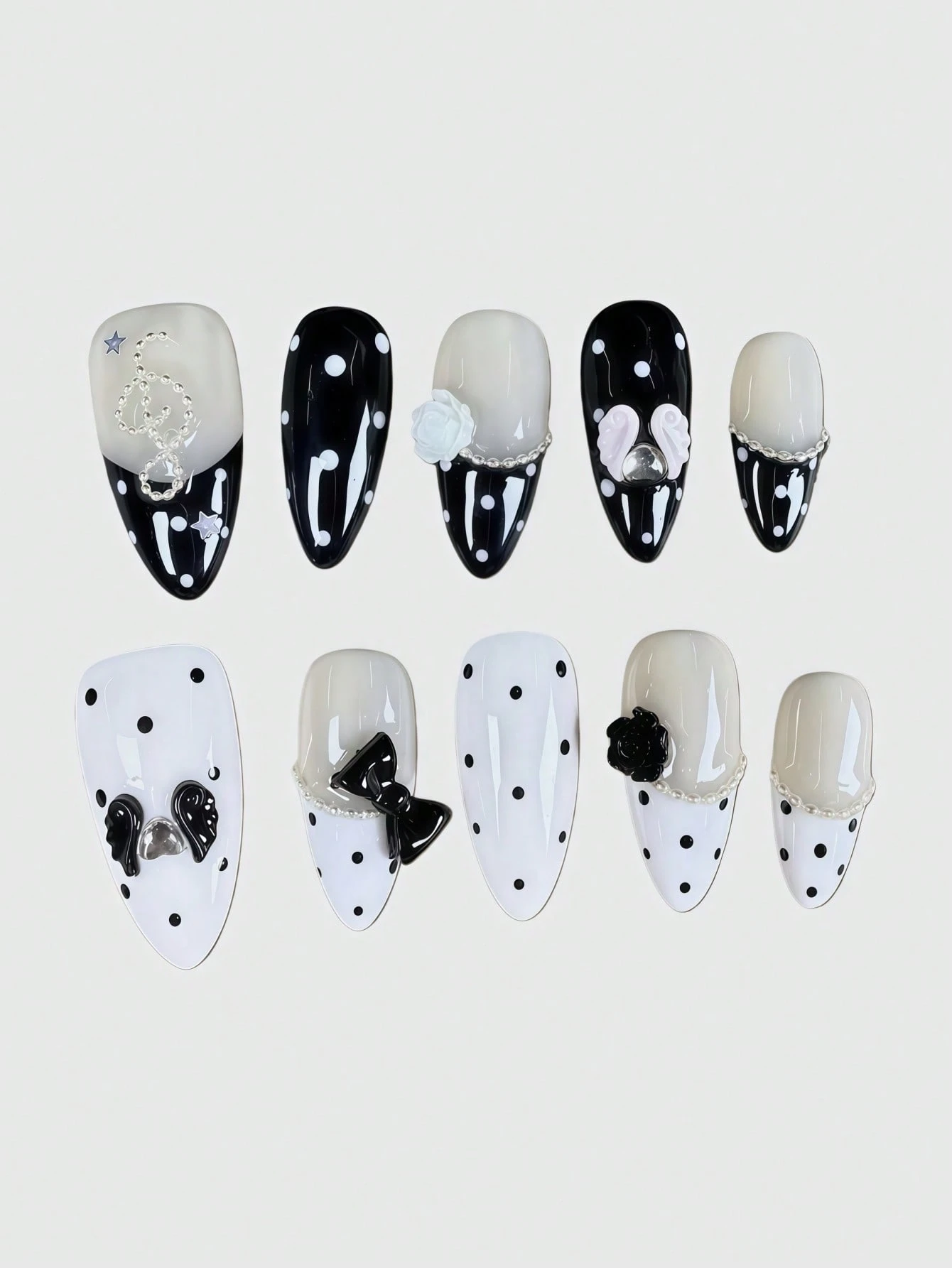 Kawaii Punte di unghie finte in stile ballerina con bordo in pizzo, fiocco romantico a forma di cuore, ali bianche in metallo e nota musicale rosa, prodotte in serie per un look energico da ragazza, adatte per uscite quotidiane e appuntamenti