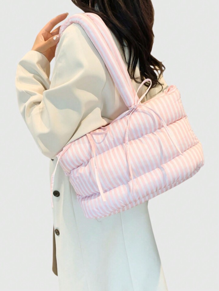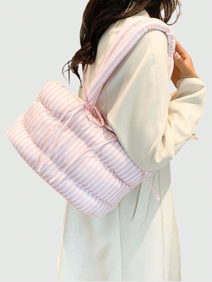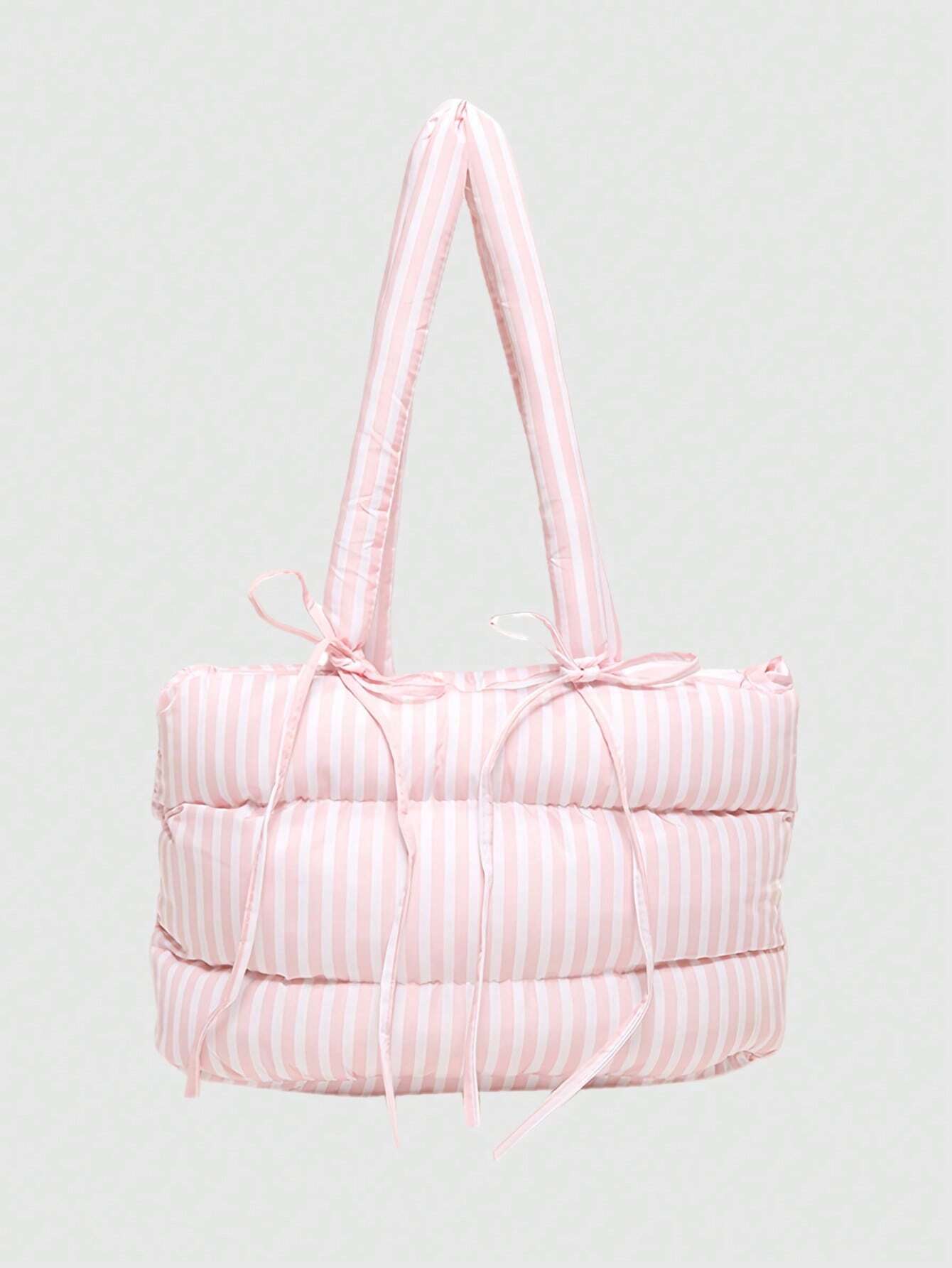 Kawaii Borsa a tracolla da donna con semplice decorazione a fiocco, borsa tote con motivo a righe e chiusura a laccetti, di grande capienza