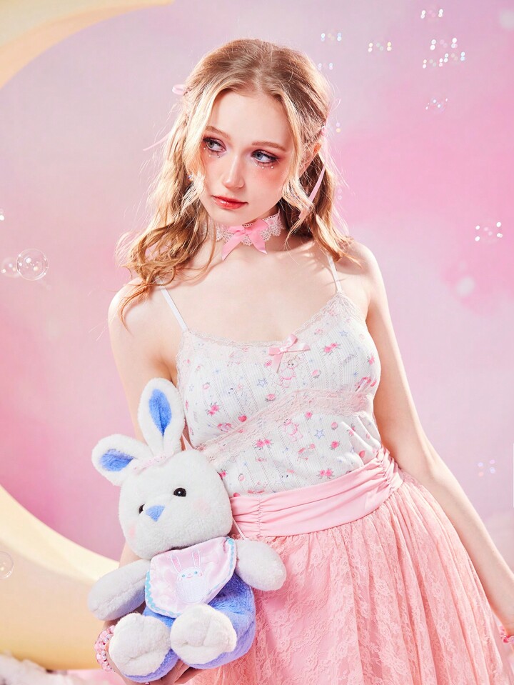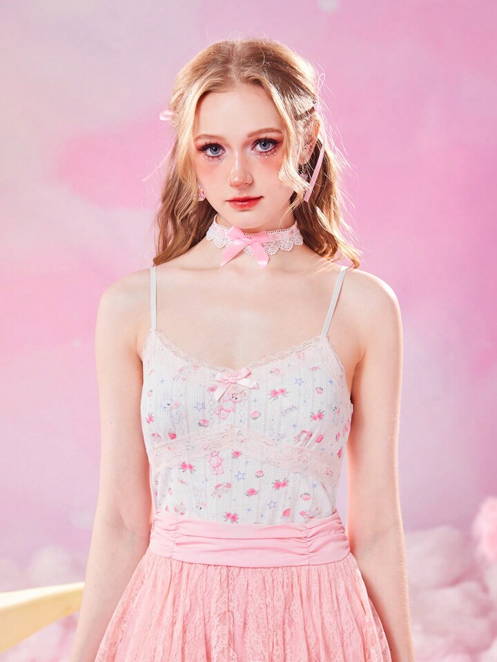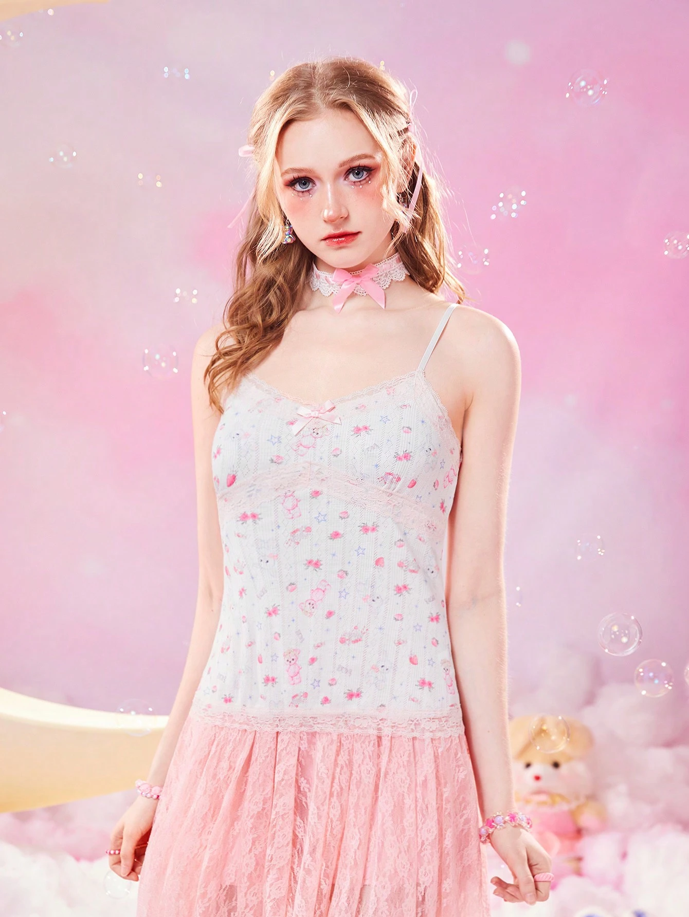 Kawaii Top bretelle sottile fiorellini con stampa orso pizzo a contrasto