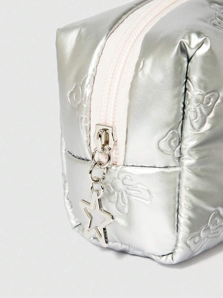Kawaii Borsa per il trucco con farfallino in texture di pelle sintetica, chiusura con zip in contrasto rosa argento, portabile per lo stoccaggio