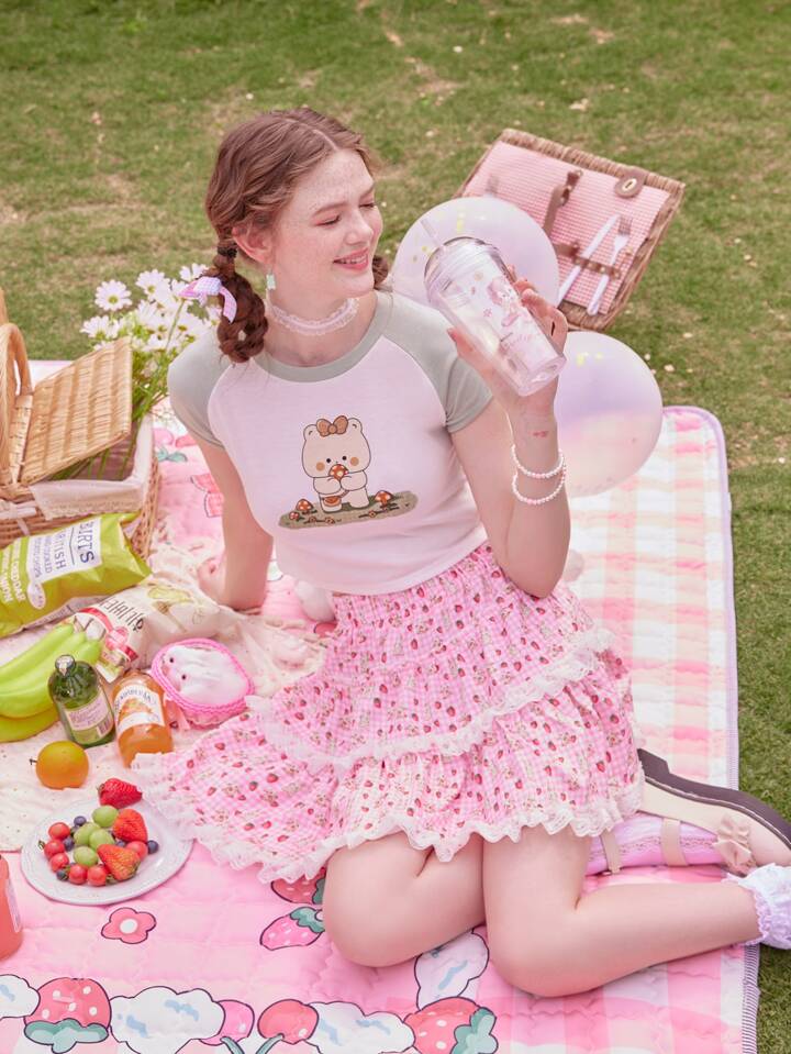 Kawaii Gonne a quadri con grafica fumetto orlo di pizzo
