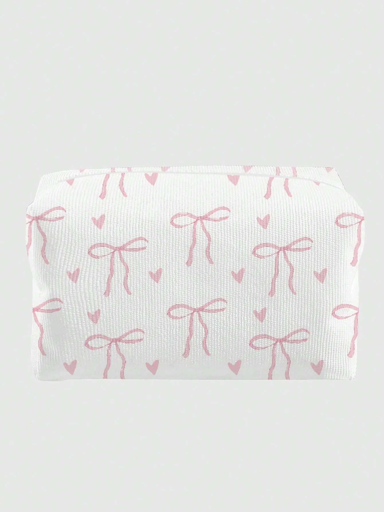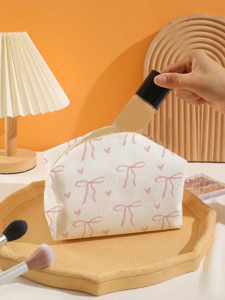 Kawaii Borsa cosmetica ottagonale in velluto con stampa a fiocco rosa