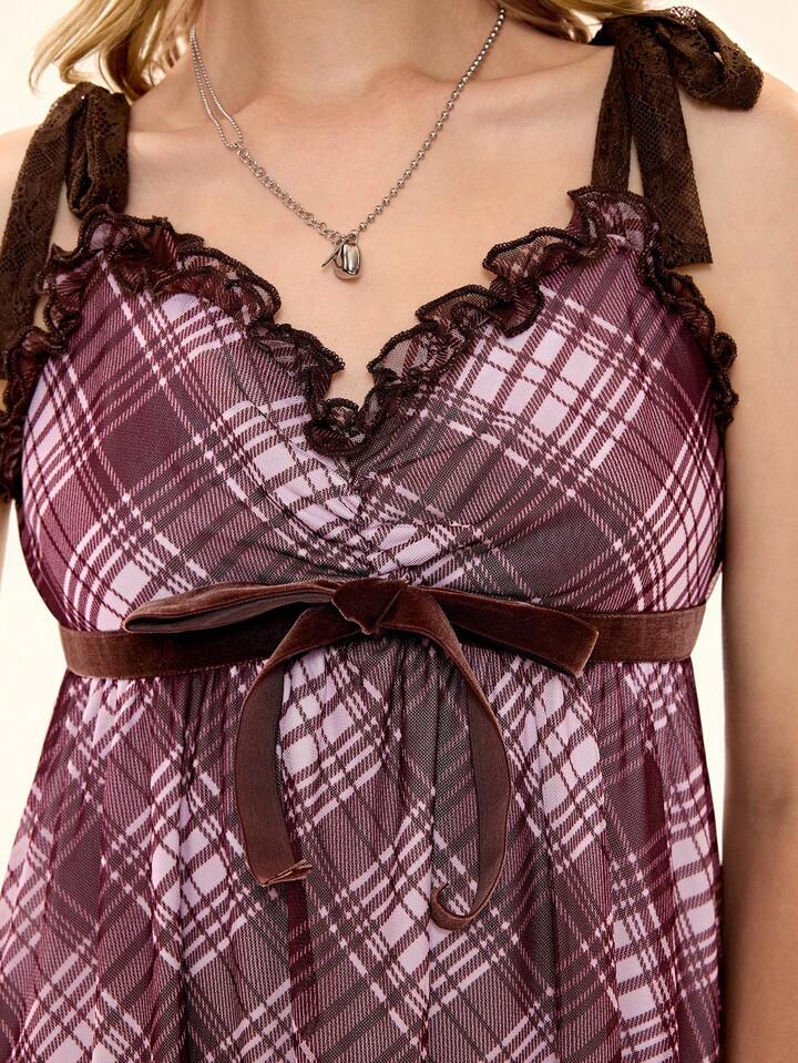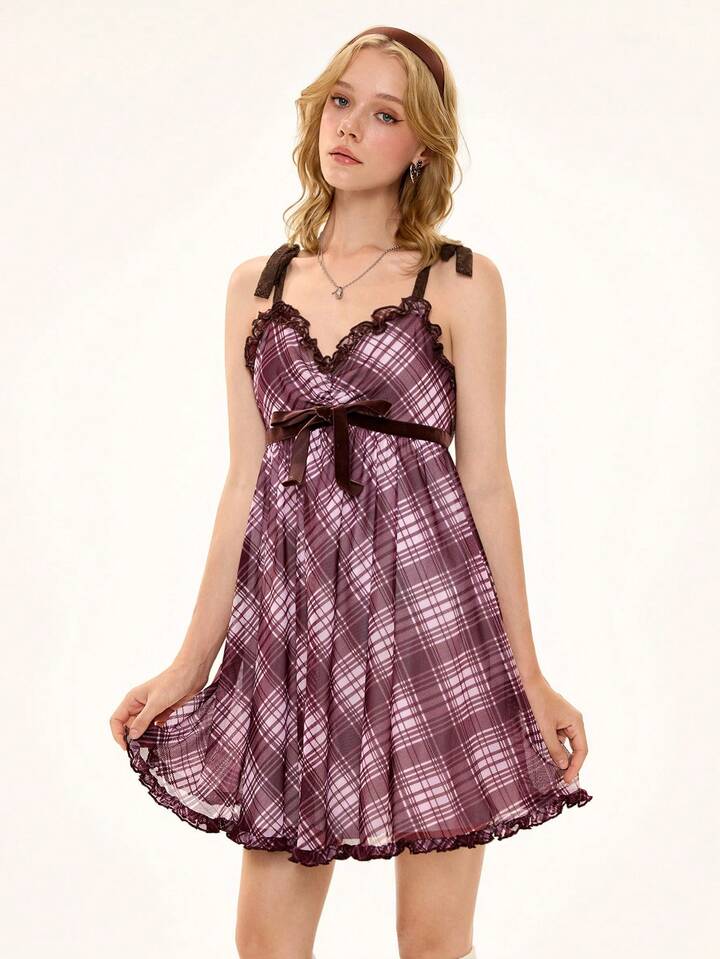 Kawaii Abito mini casual e ampio da donna con volant e stampa a quadri