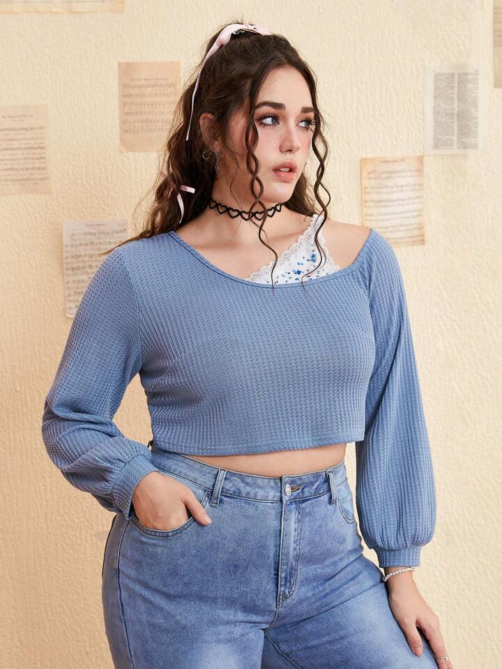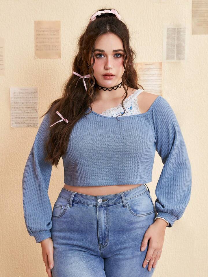 Kawaii Taglie Forti Maglietta corta scollatura asimmetrica manica a lanterna