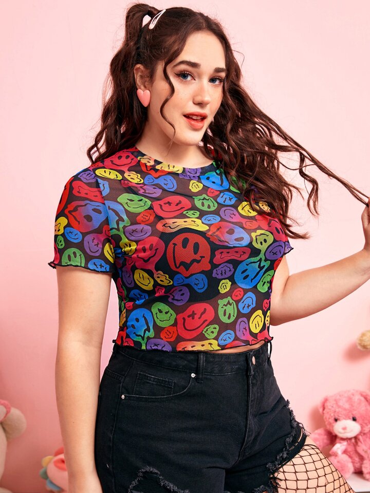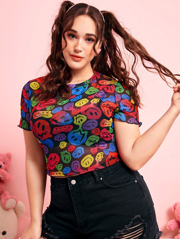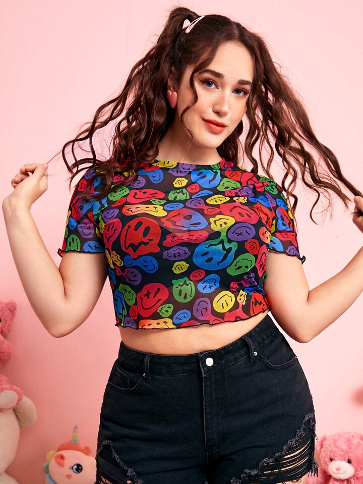 Kawaii Taglie Forti Top con grafica fumetto orlo lattuga corto mesh