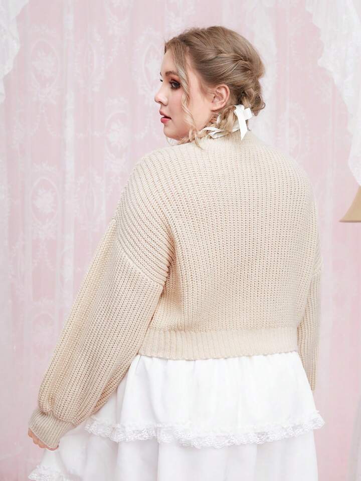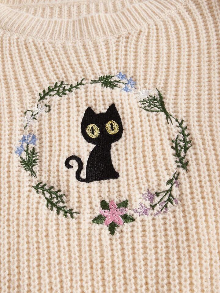 Kawaii Taglie Forti Maglione floreale & gatto con ricamo spalle cadenti