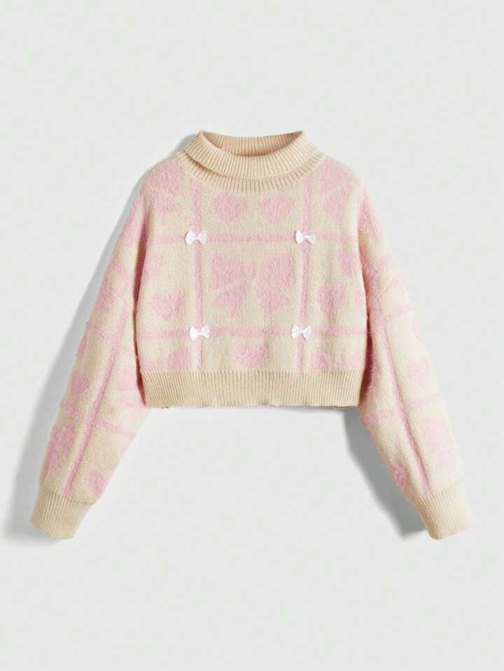 Kawaii Taglie Forti Maglione corto motivo scozzese collo alto spalle cadenti