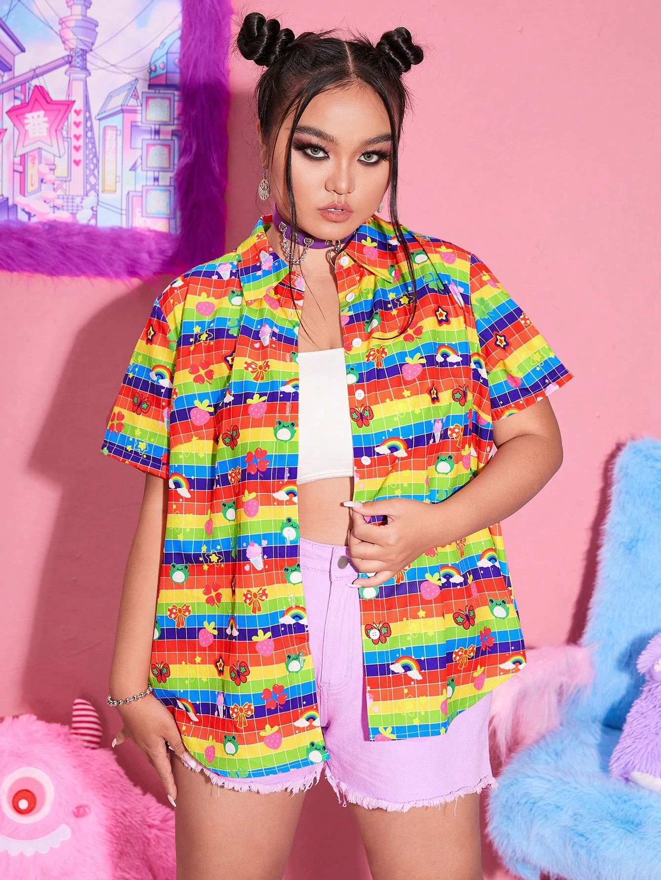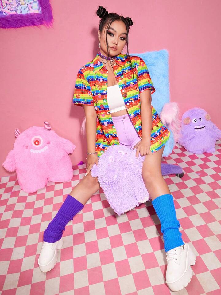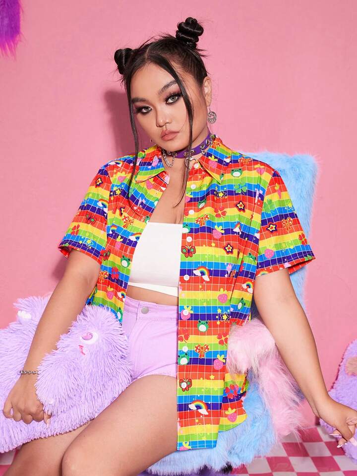 Kawaii Taglie Forti Camicia a righe arcobaleno & con grafica fumetto
