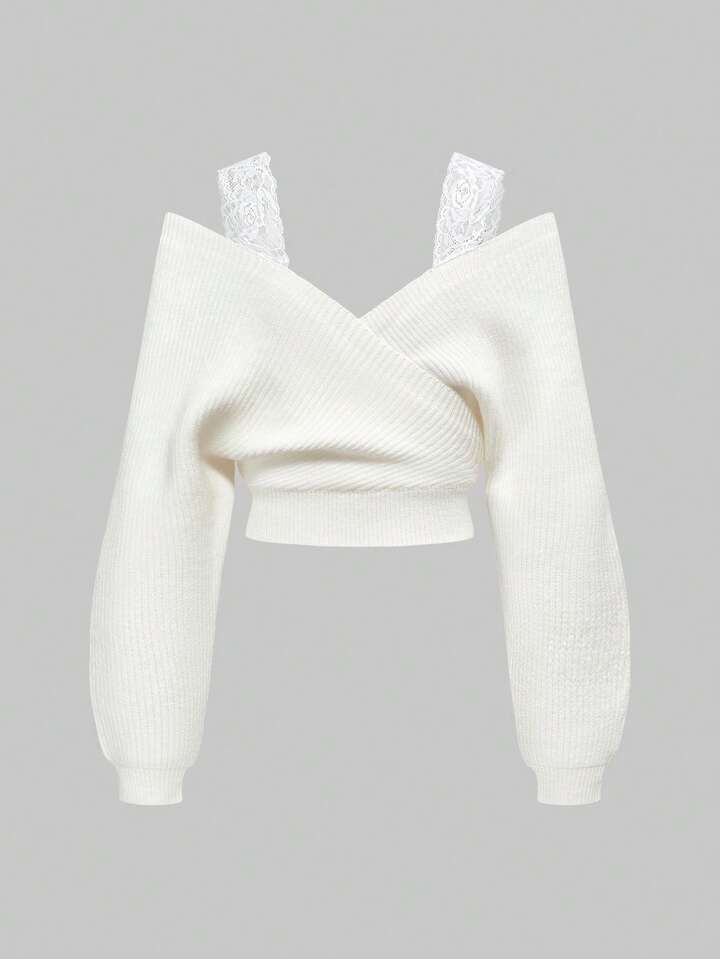 Kawaii Set di maglioni in maglia morbida con inserti in pizzo e spalle scoperte, versatile, adatto per taglie comode, autunno/inverno